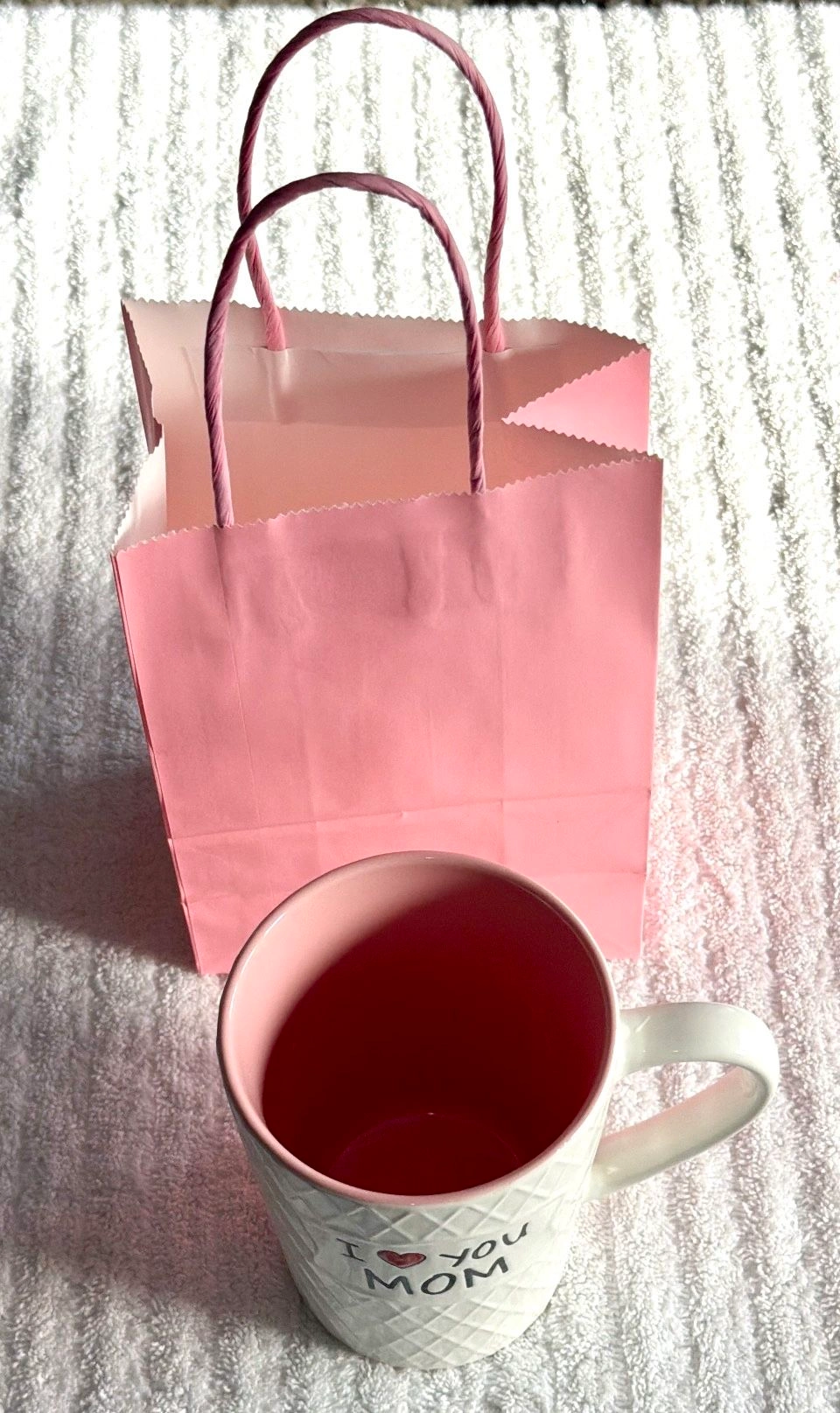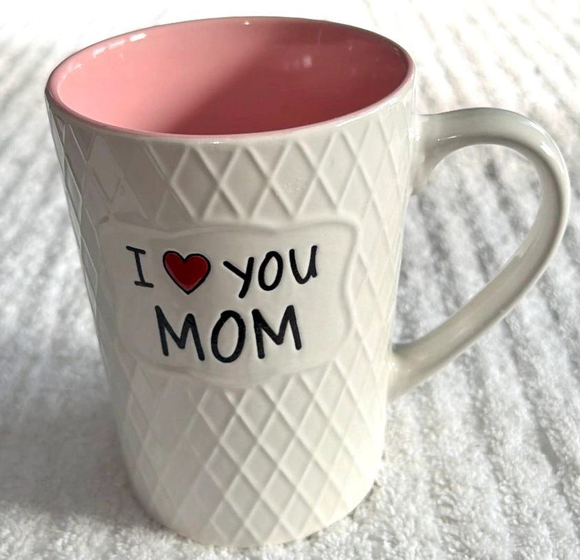 This is a lovely 16-ounce ceramic mug with an "I Love You Mom" design, perfect for Mother's Day or any occasion to show appreciation. It features a unique double-sided design with a geometric relief on the outside and a pink glaze on the inside for a comfortable, non-slip grip.