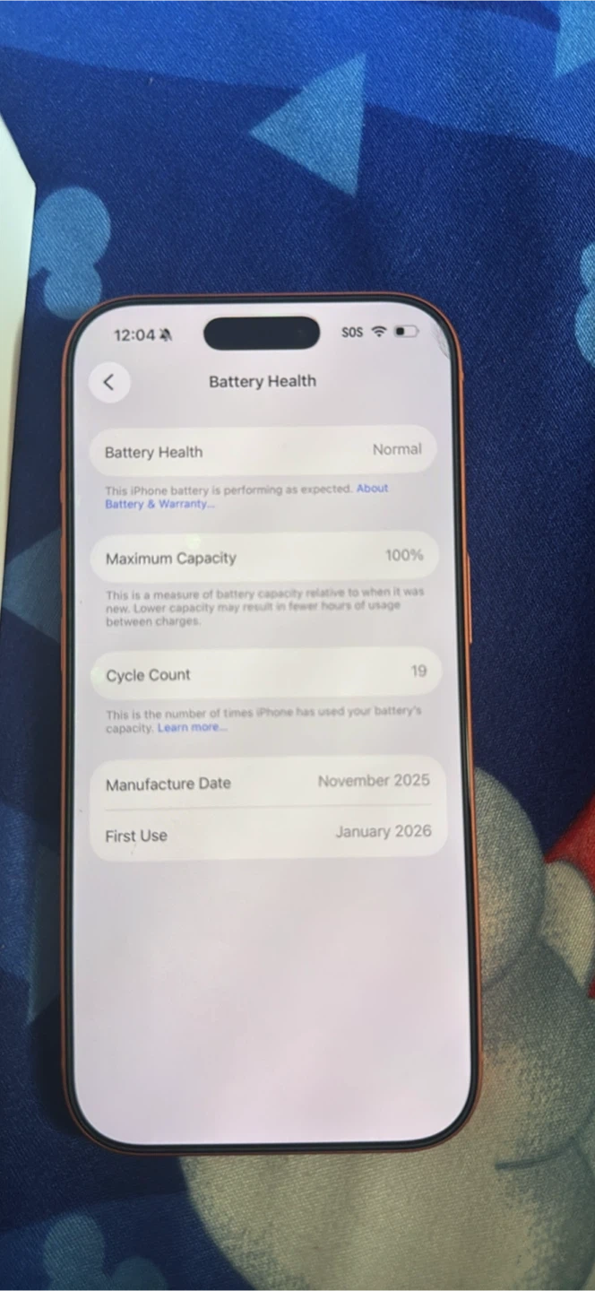 This is an Apple iPhone 17 Pro in orange. The maximum battery capacity is 100% with a cycle count of 19. It was manufactured in November 2025 and first used in January 2026. Includes original packaging.