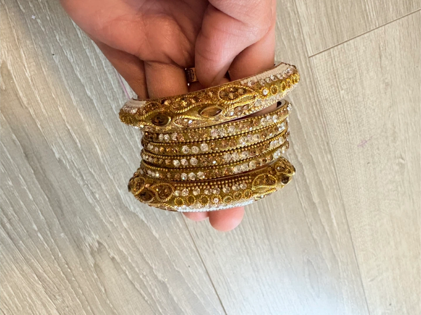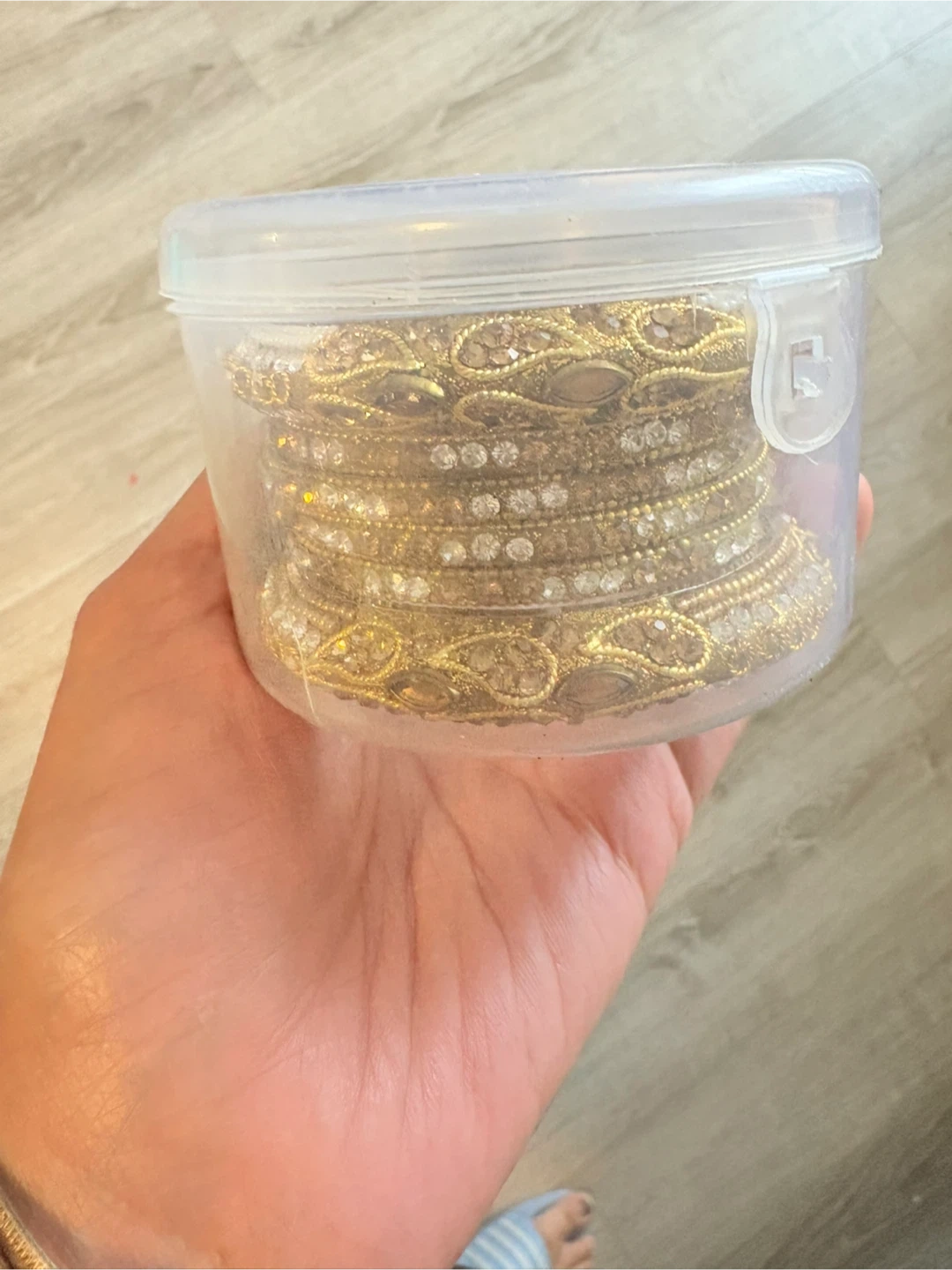 Selling a set of bangles. They have a beautiful, intricate design with small stones, perfect for adding a touch of elegance to any outfit. Comes in a container for easy storage