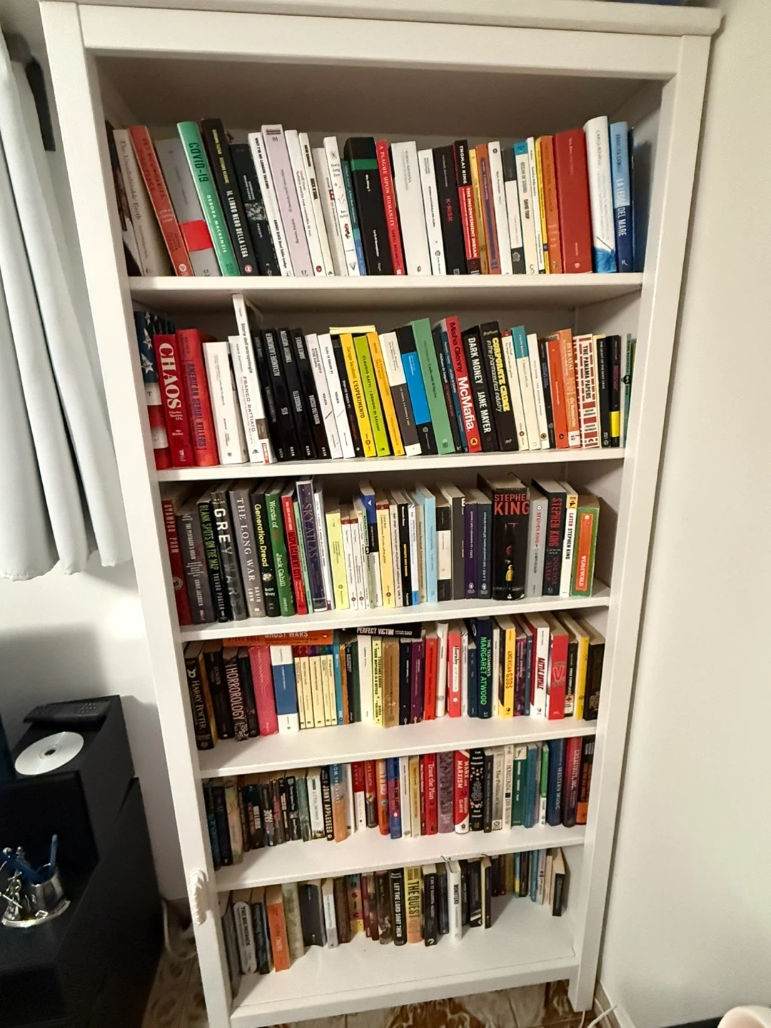 This is a tall, white Hemnes bookcase from IKEA. It has six shelves that are adjustable. Perfect for storing books, decor, or other items in your home.