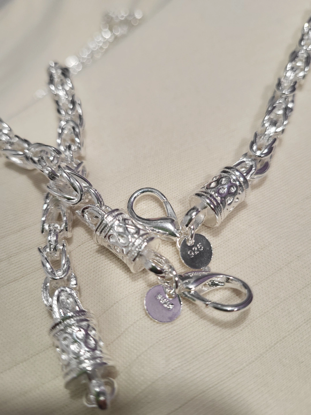 Beautiful silver Byzantine chain necklace and bracelet set. Matching designs. Lobster clasps. Excellent design