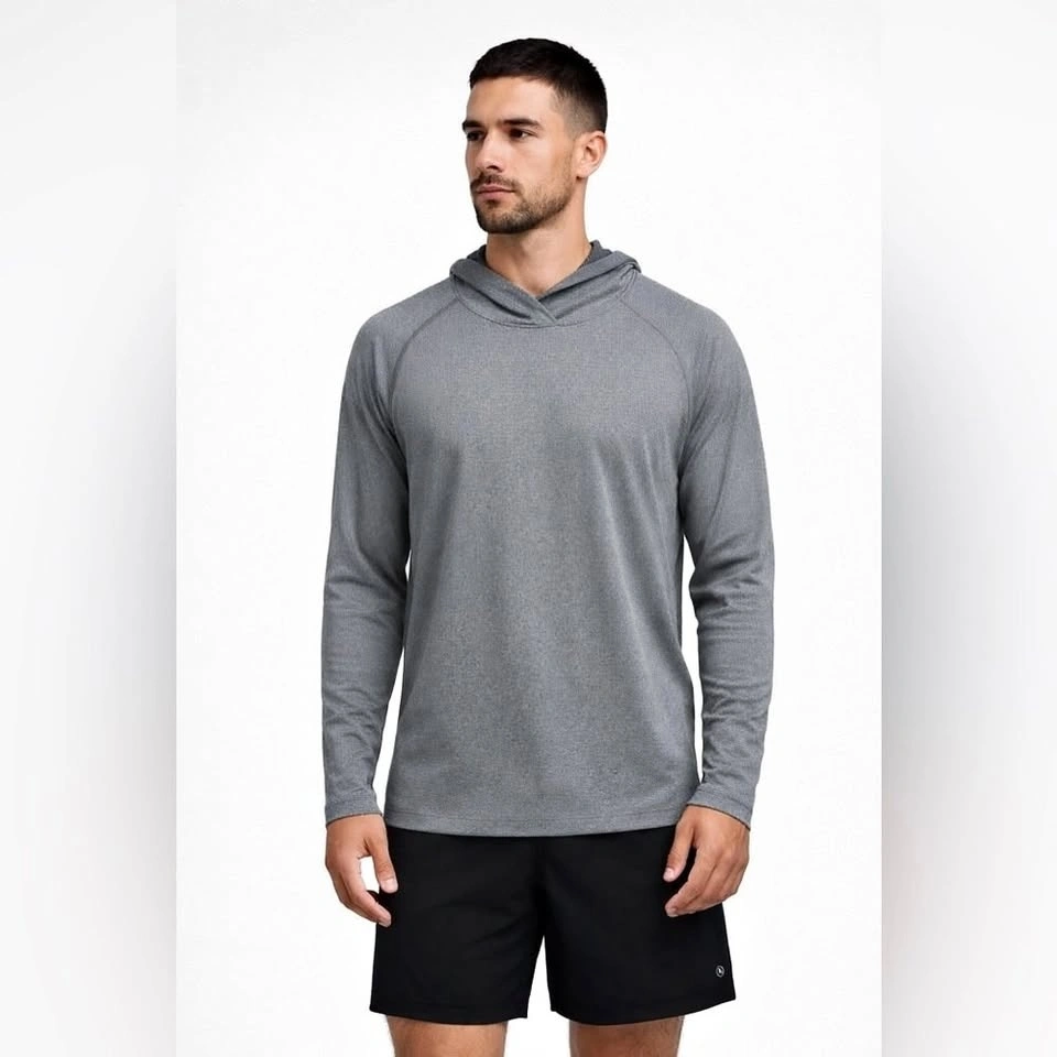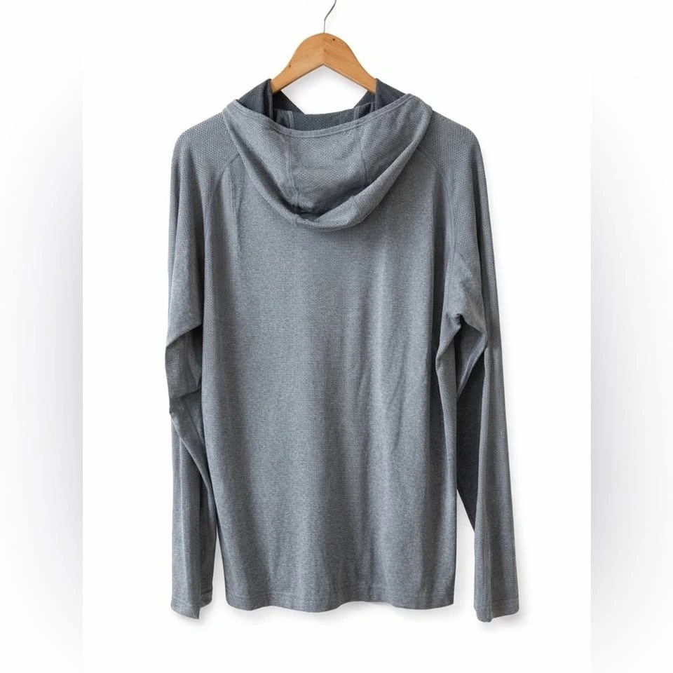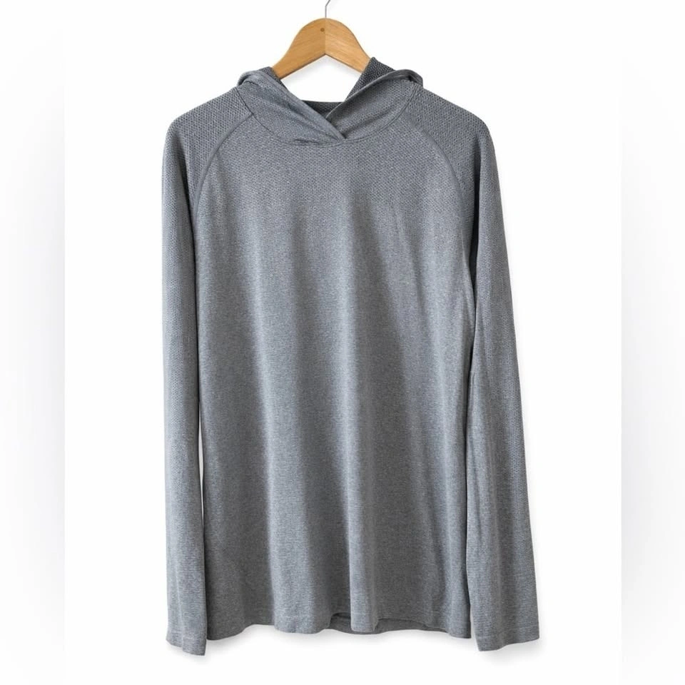 Stylish light gray Lululemon long sleeve with hoodie. Perfect for casual wear or workouts. P2P: 23 inches, Length: 30 inches. Excellent condition, no stains, pilling, or holes. From a smoke-free home.
