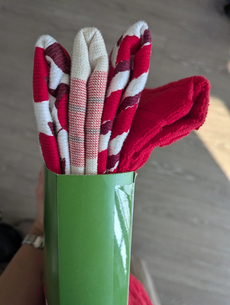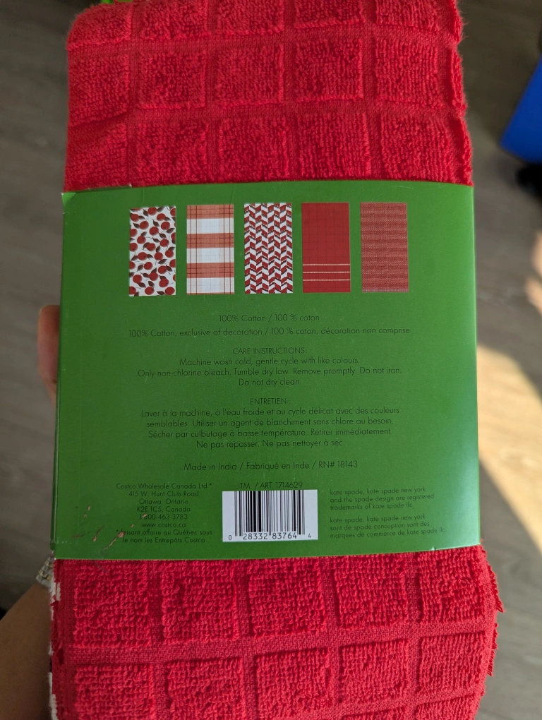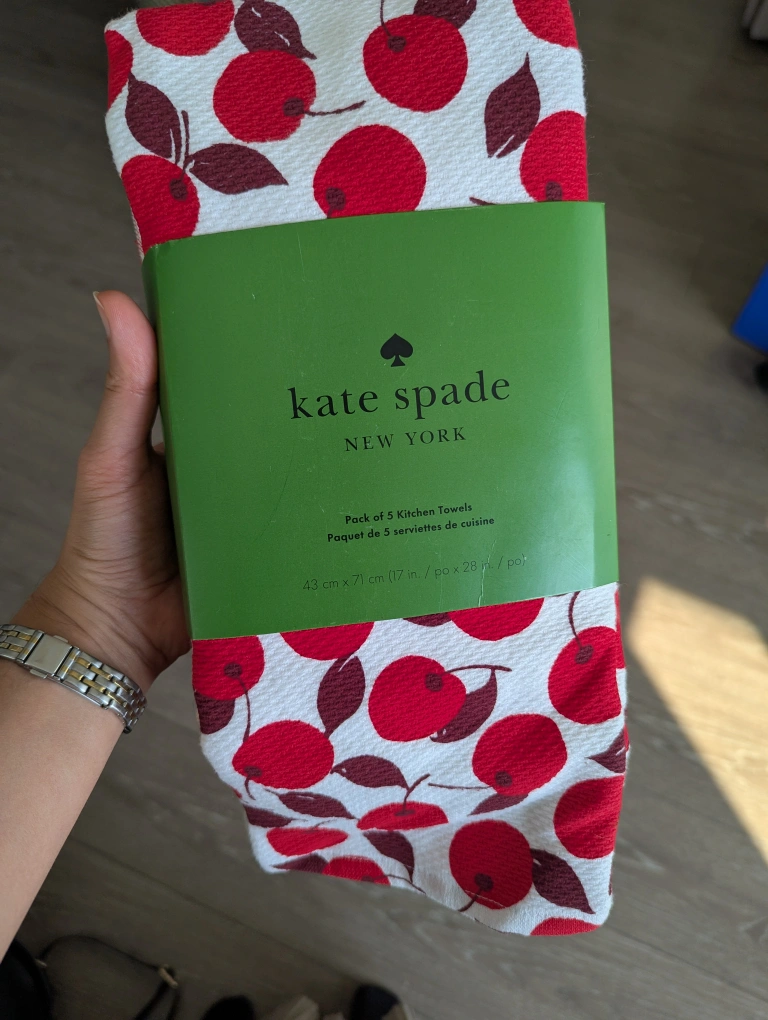 Here's a pack of 4 Kate Spade New York kitchen towels! They're brand new and still in the original packaging. The towels are 43 cm x 71 cm (17 in x 28 in) and made of 100% cotton. They feature a variety of patterns, including a cherry print and stripes.
