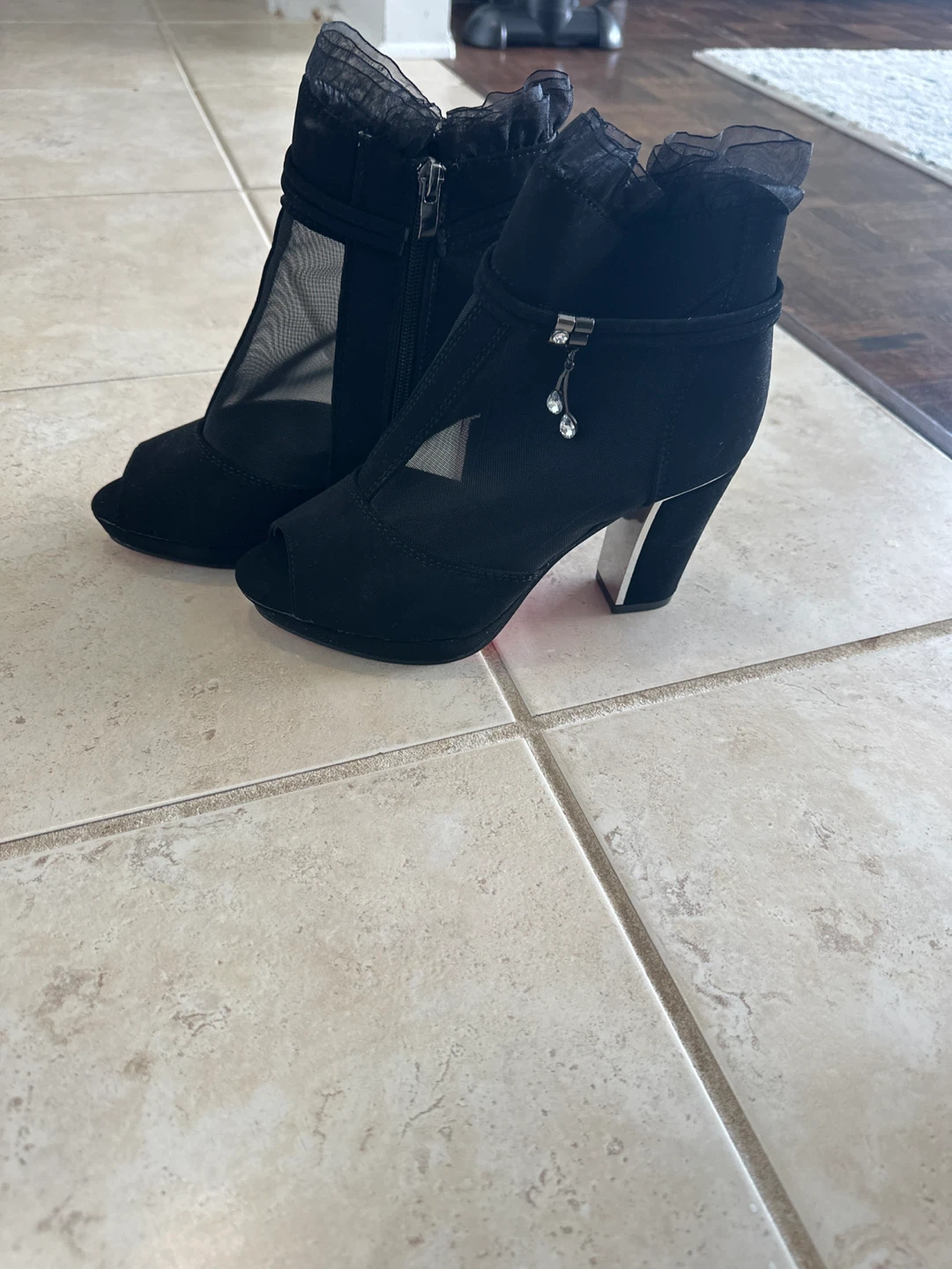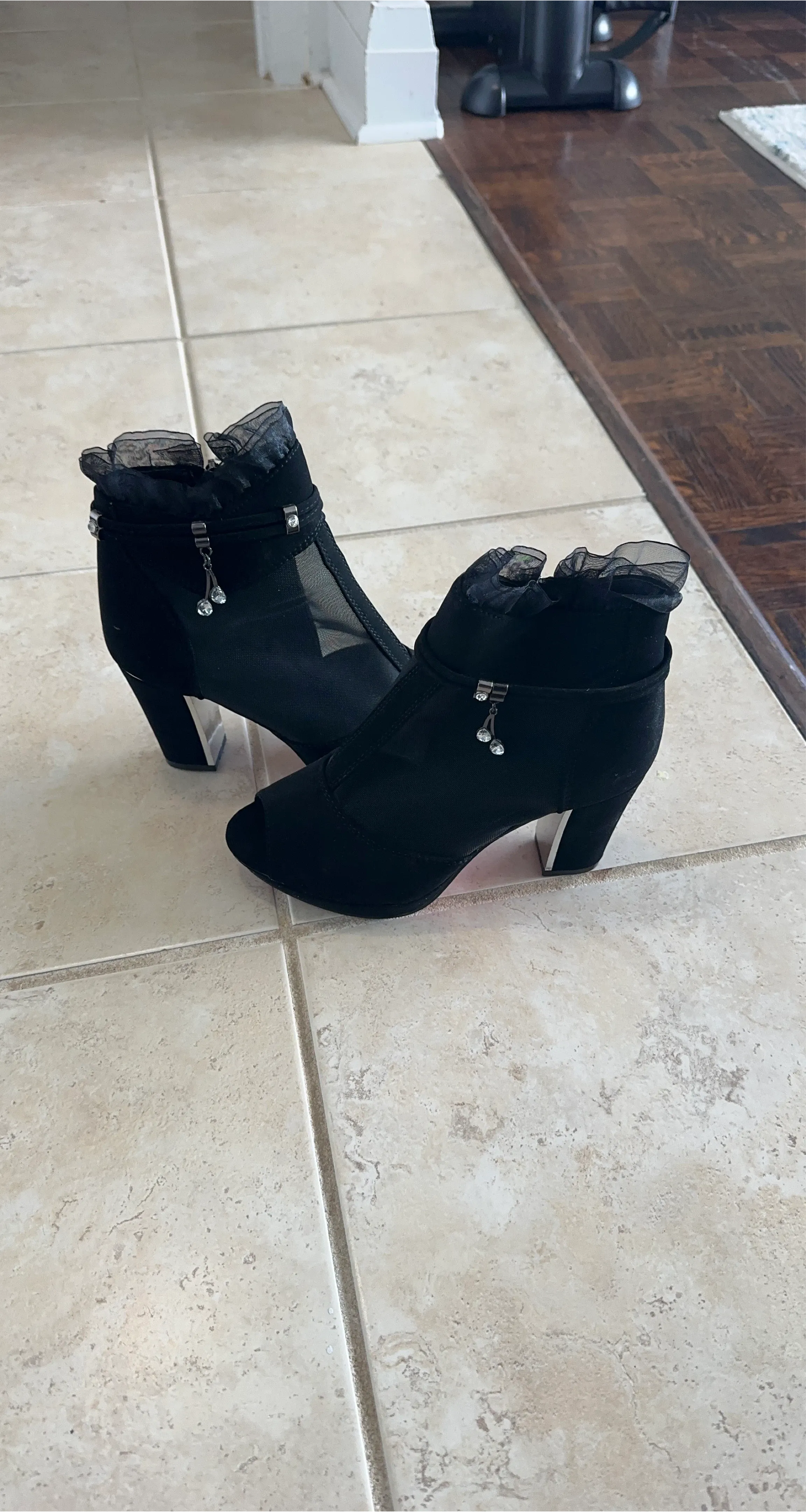 These stylish black booties feature a peep-toe design with a mesh upper and a cute ruffle detail. The heels are a comfortable height for all-day wear and they have a unique silver accent. Perfect for dressing up any outfit!