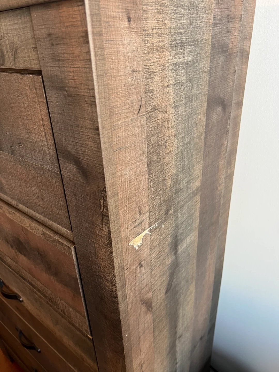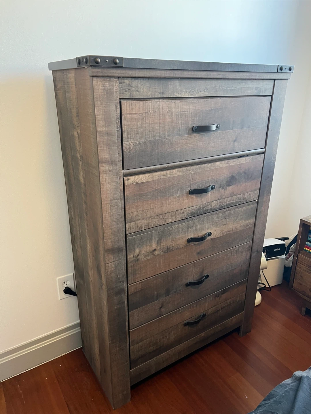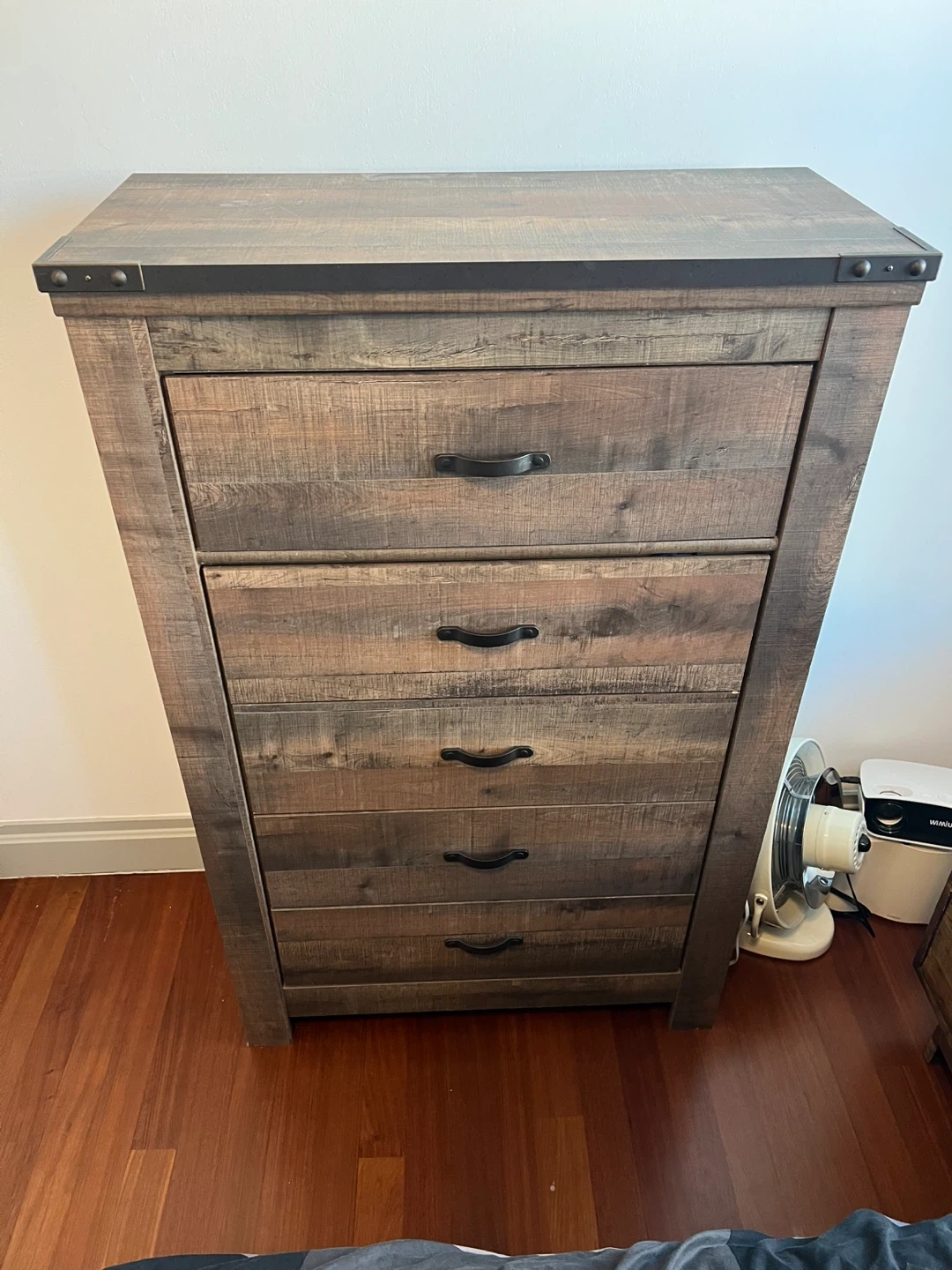 Buy & SellTall 5-Drawer DresserTall 5-Drawer Dresser$194Rustic wood finish tall dresser with five drawers. Features metal accents on top edge and black drawer pulls. Minor scuffing on side panel.ConditionGoodDimensions34” x 16” x 54.5”WHERE TO MEET10031View MapSELLERverifiedJeffreyHamilton Heights600 reviews1 chats·0 favorites·27 viewsSEND CHAT TO SELLERHi Jeffrey! I’m interested in your listing.Hi Jeffrey! I’m interested in your listing.Get the Karrot app to chatSign In to chat