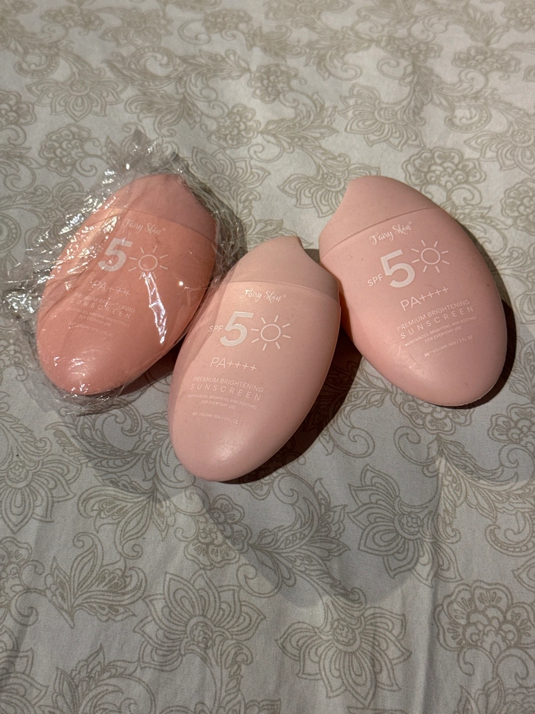 Three bottles of Fairy Skin SPF 50+ PA++++ Premium Brightening Sunscreen. Moisturizes, brightens, and soothes. Excellent for everyday use.