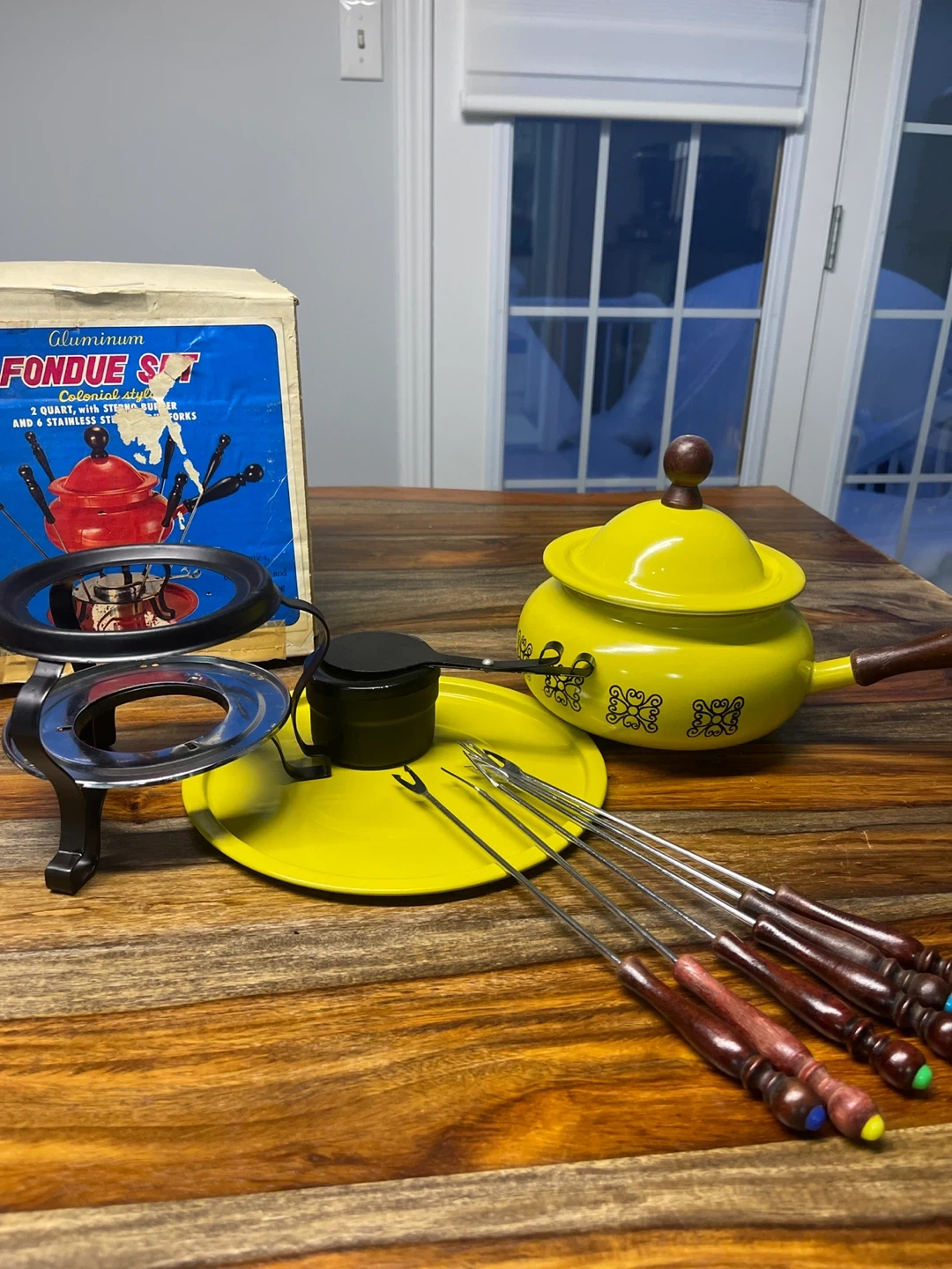 This aluminum vintage fondue set is yellow and has a 2-quart capacity. It includes the pot, burner, fondue forks, and a stand. Makes gathering for a cozy meal fun!