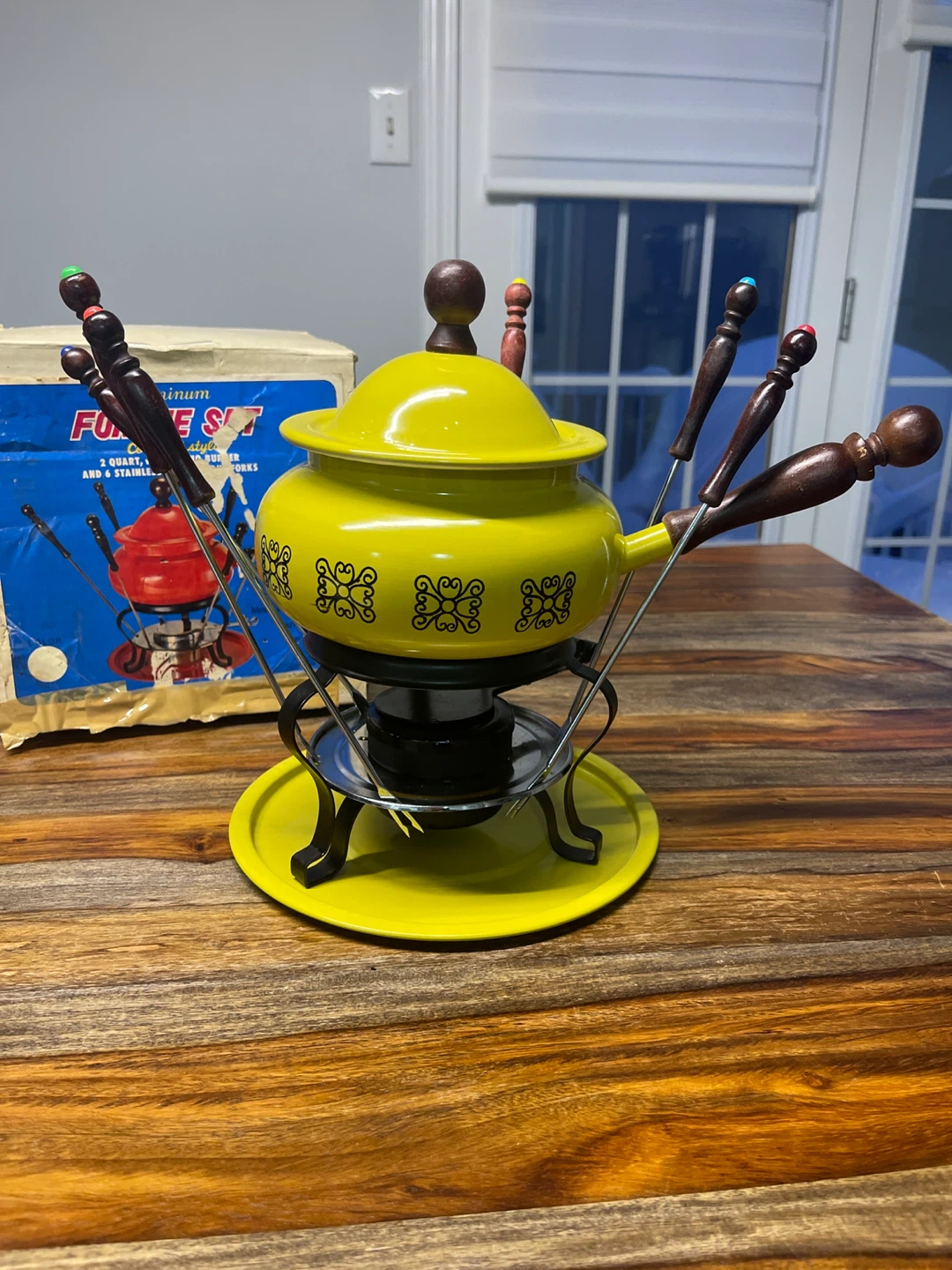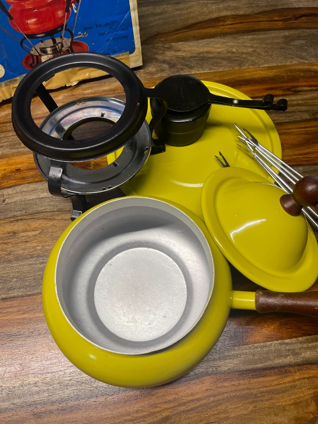 This aluminum vintage fondue set is yellow and has a 2-quart capacity. It includes the pot, burner, fondue forks, and a stand. Makes gathering for a cozy meal fun!