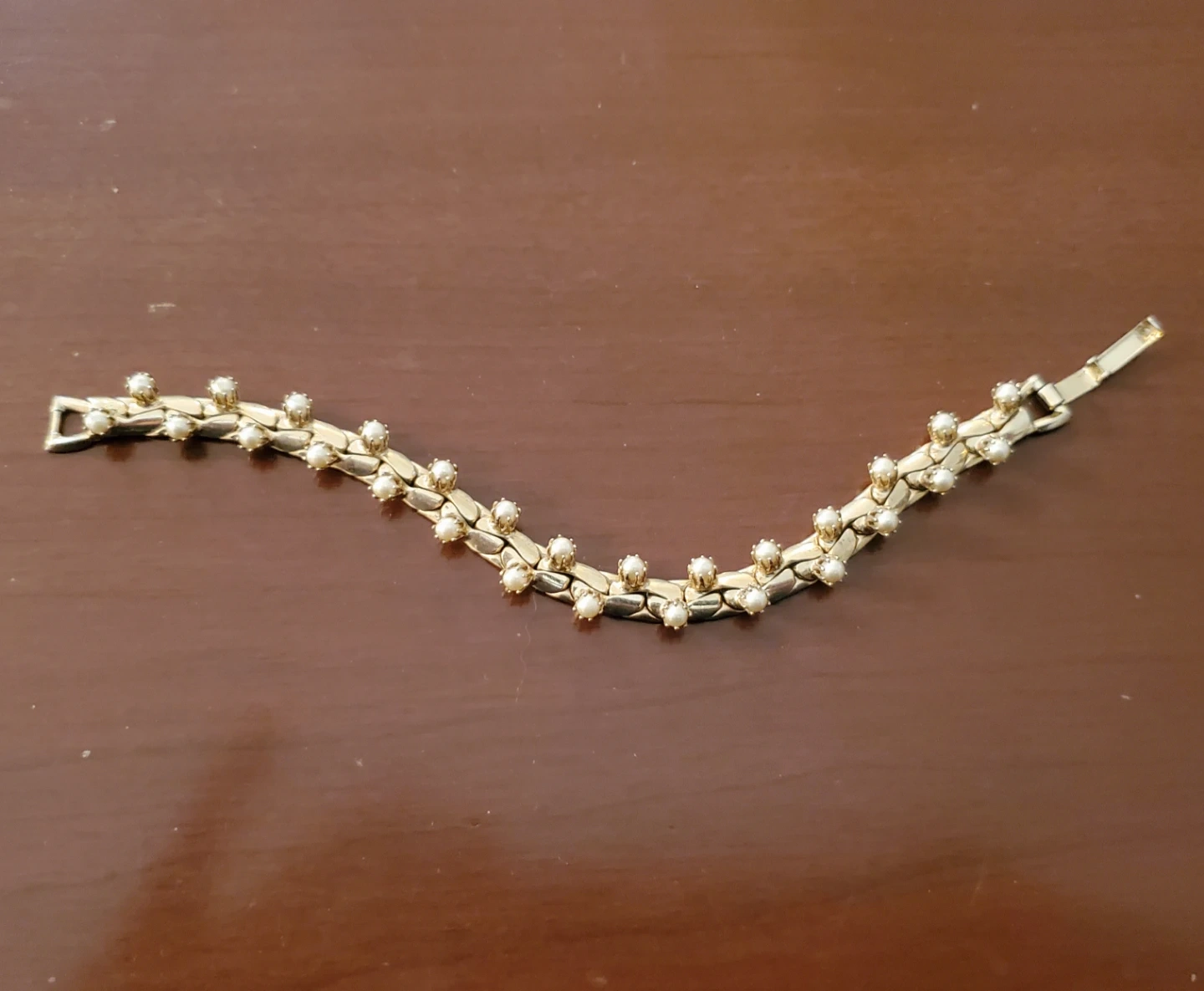 This set includes a 5 strand graduated faux pearl necklace, a bracelet, and screw-back earrings Marked "Pamela".