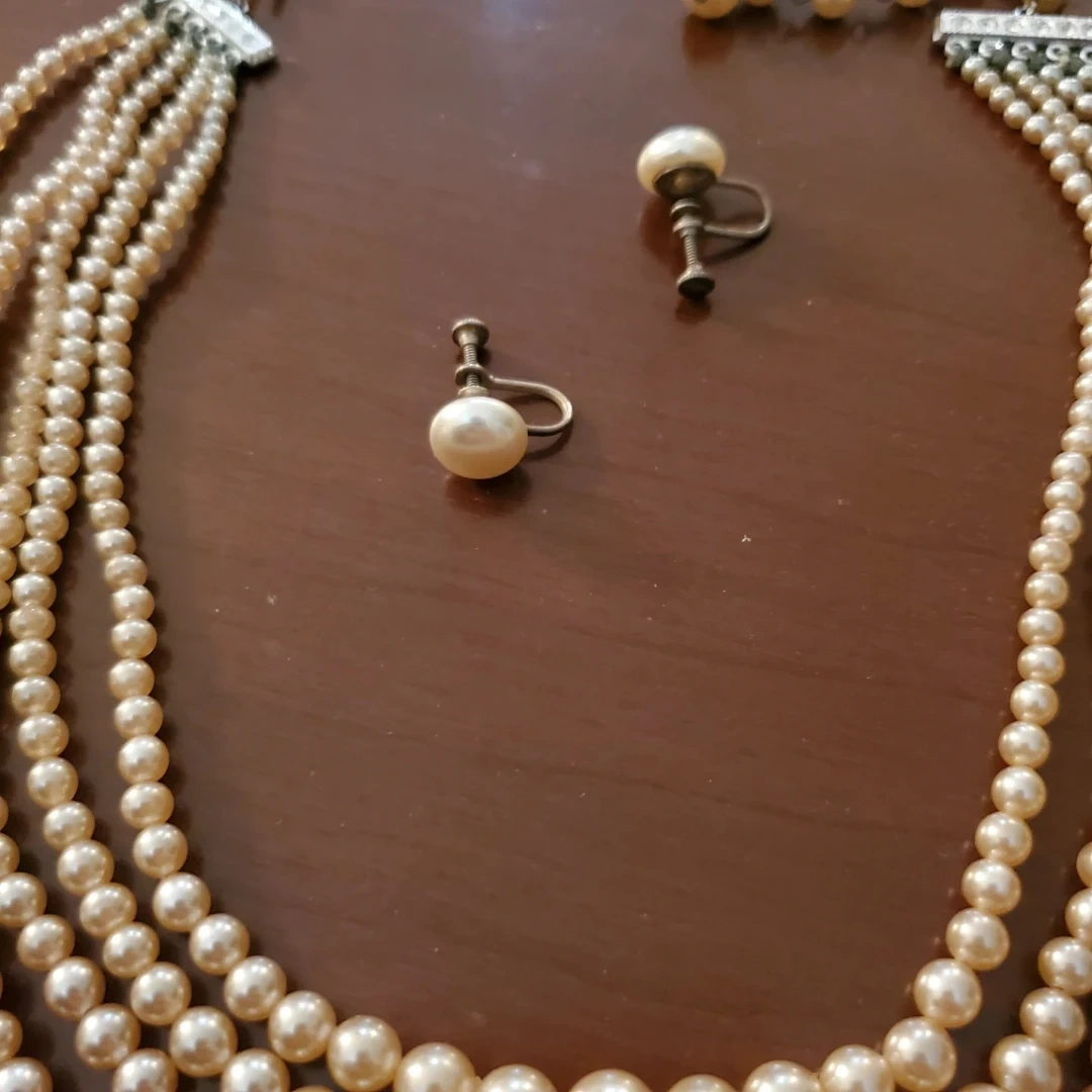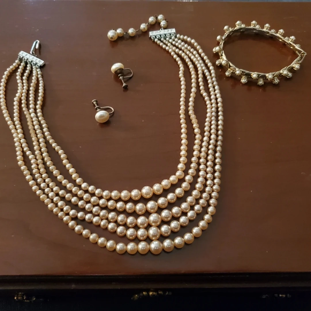 1940's 5-Strand Pearl Necklace, Bracelet & Screw Back Earrings