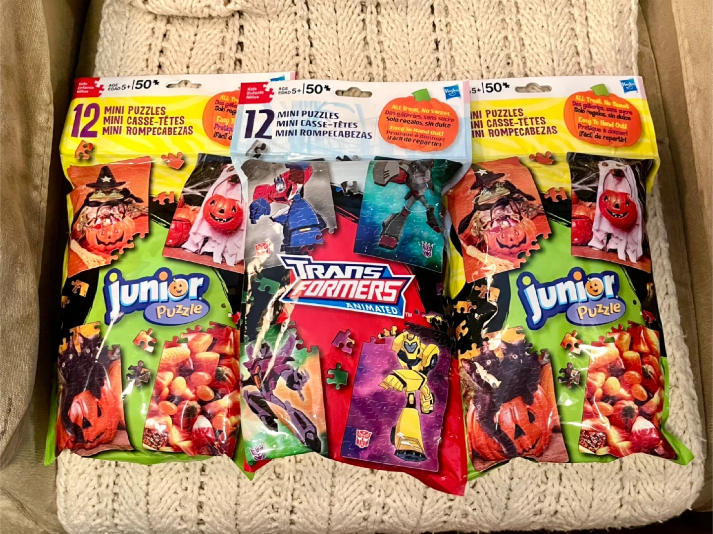 I have a 3 packs of 12 mini puzzles, including Junior Puzzles with Halloween themes and Transformers Animated puzzles! Perfect for a fun activity, Halloween handouts or party favours.