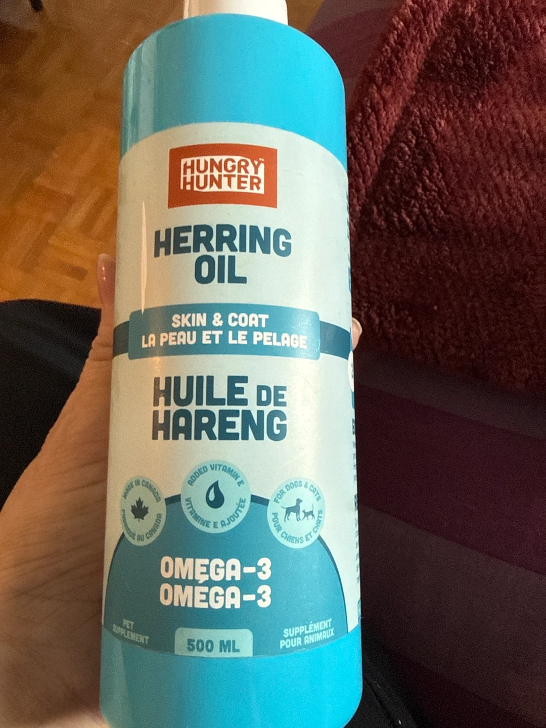 Hungry Hunter Herring Oil pet supplement for skin and coat. Added Vitamin E, Omega-3. Made in Canada. 500 mL bottle.