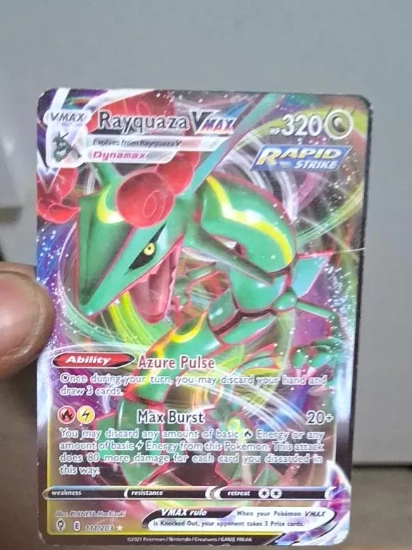 This is a Pokemon Rayquaza VMAX trading card from the Rapid Strike set. It features the 'Azure Pulse' ability and the 'Max Burst' attack. The card has 320 HP and is card number 111/203.