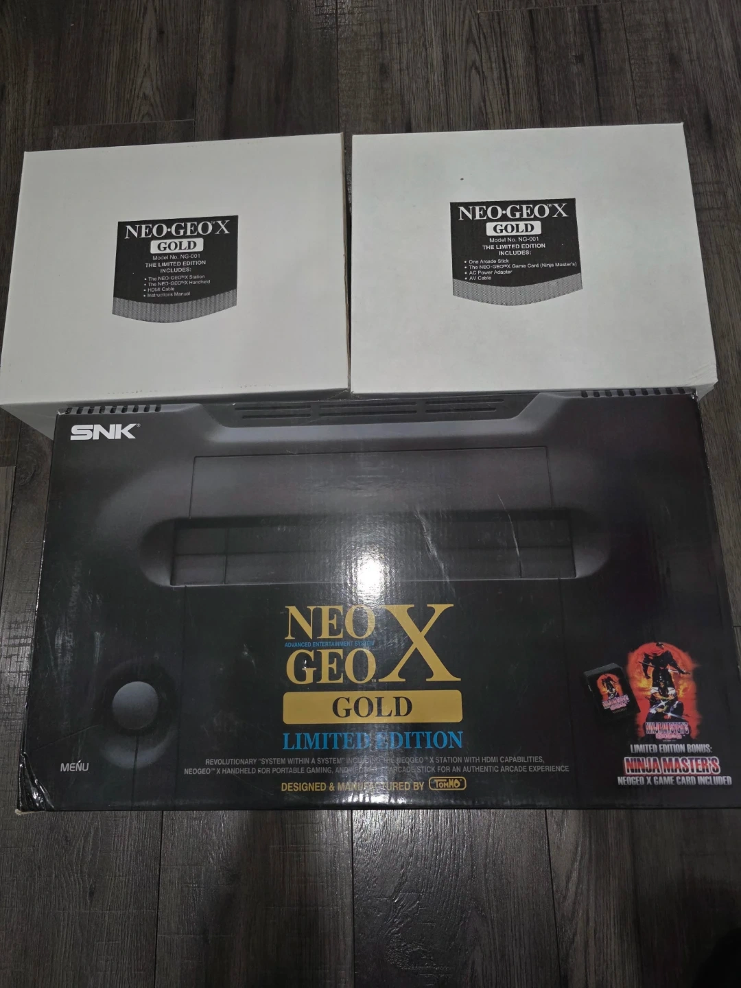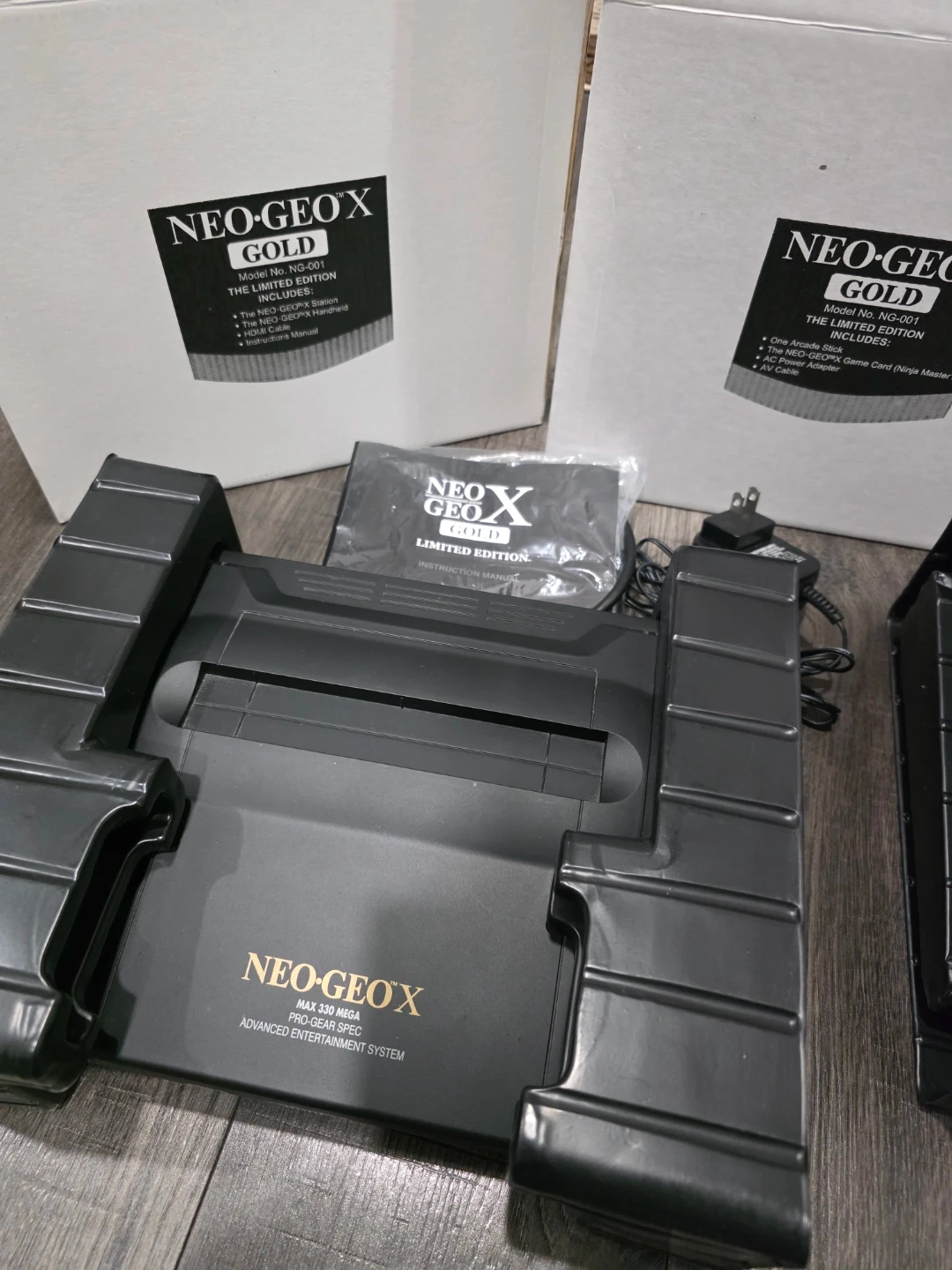 Up for grabs is a SNK Neo Geo X Gold Limited Edition handheld console! This is a revolutionary system that's a handheld and a console with HDMI capabilities. It's designed for an authentic arcade experience on the go. Includes original arcade stick, Neo Geo X handheld, Neo Geo X station, power adapter, and AV cable. Selling for great price
