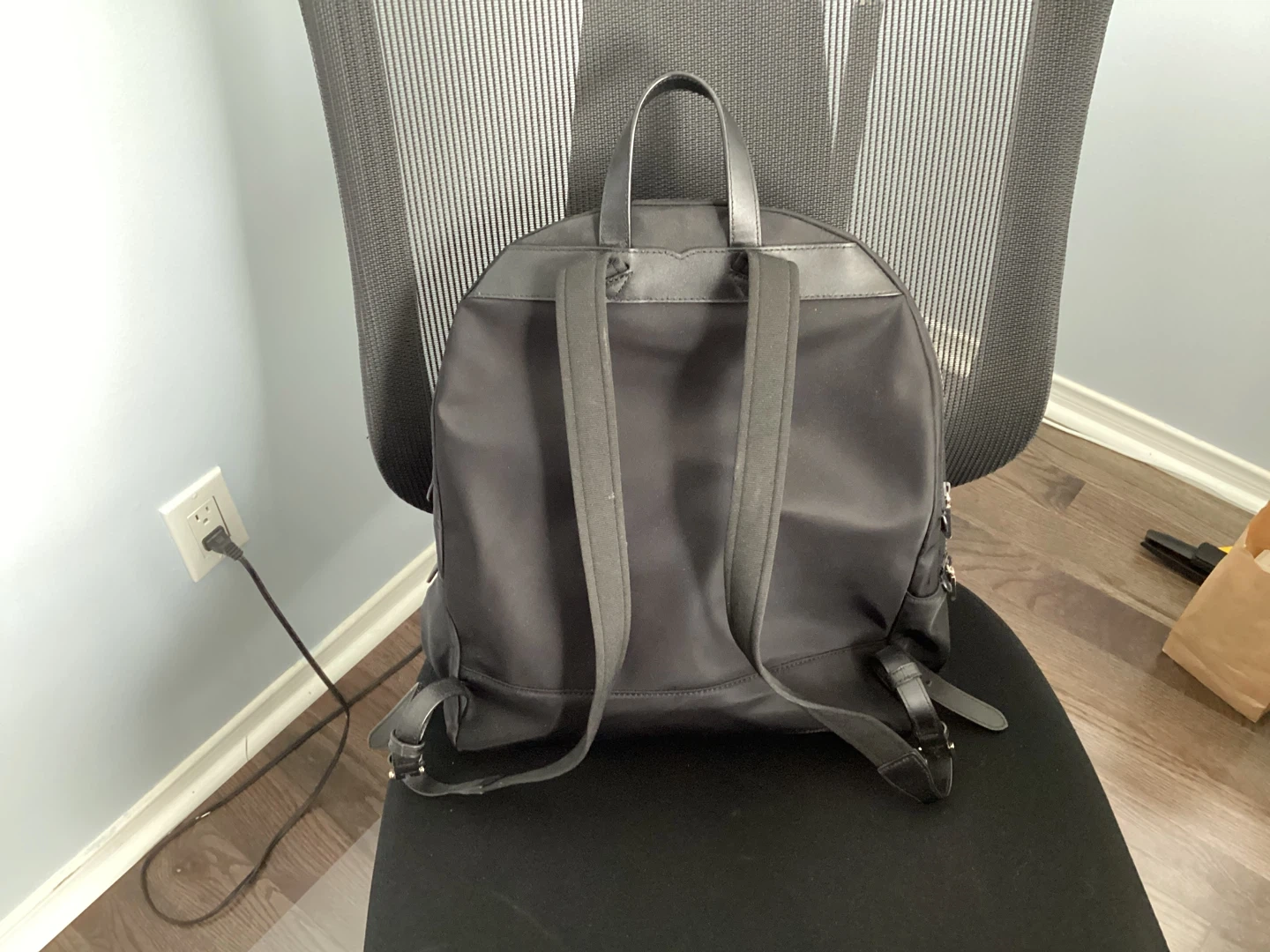 This is a black nylon backpack from Kate Spade. It's made with durable nylon and has leather accents. Plenty of room for your everyday essentials!