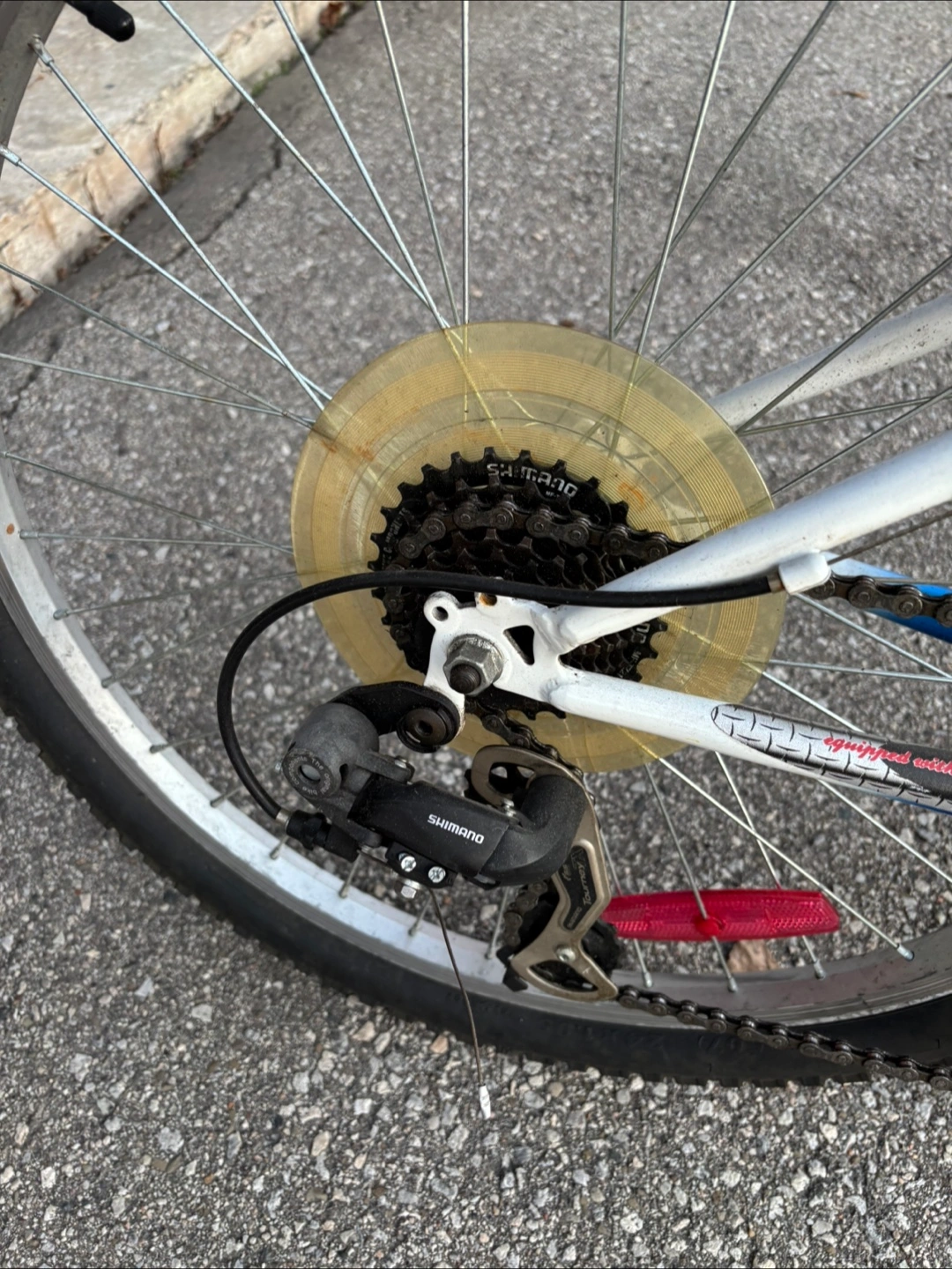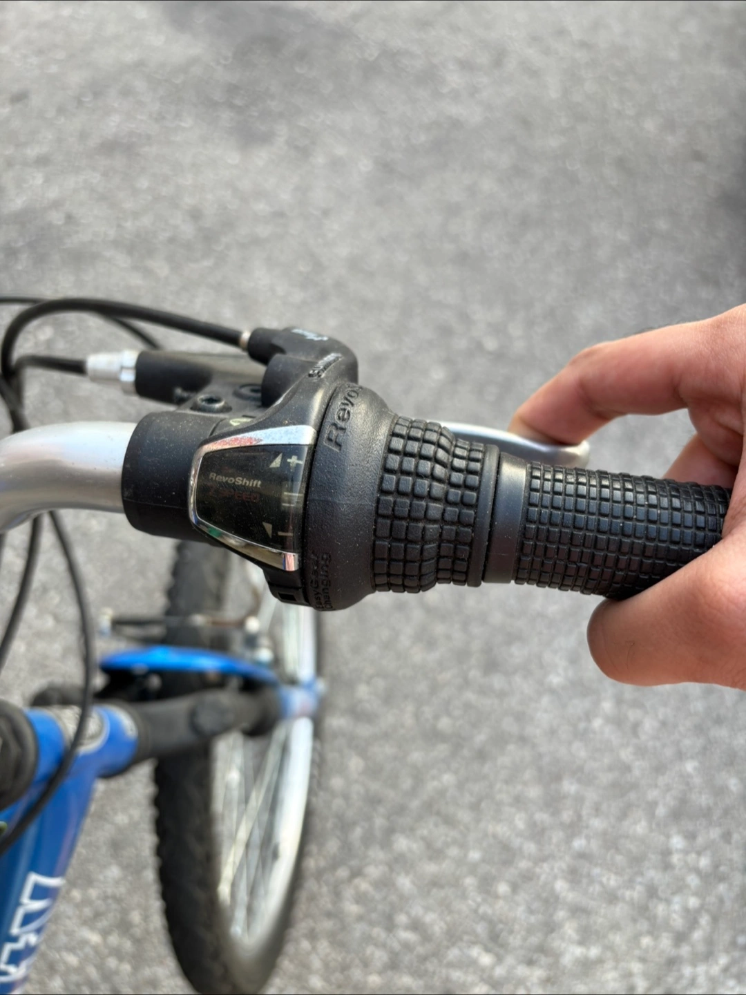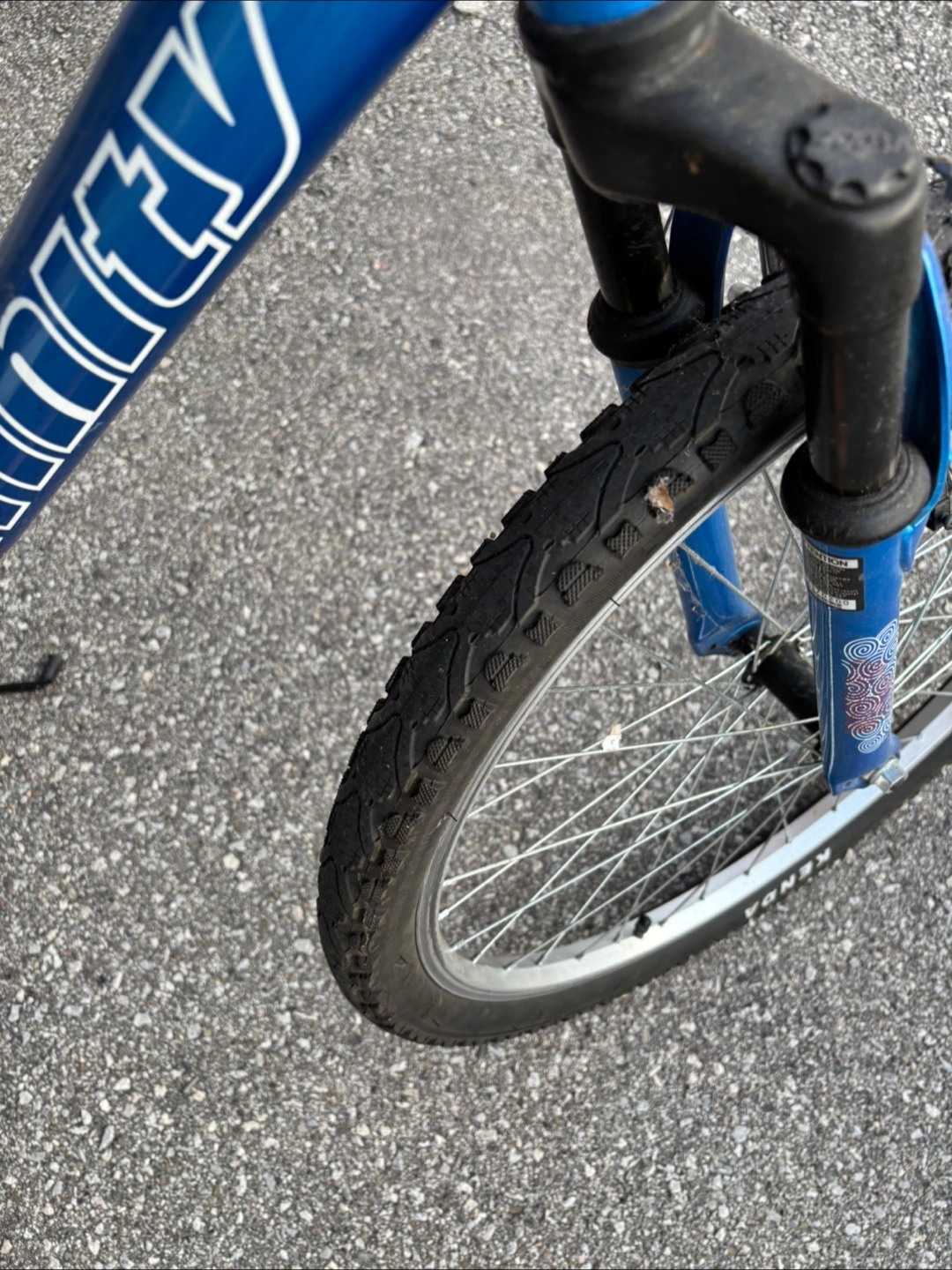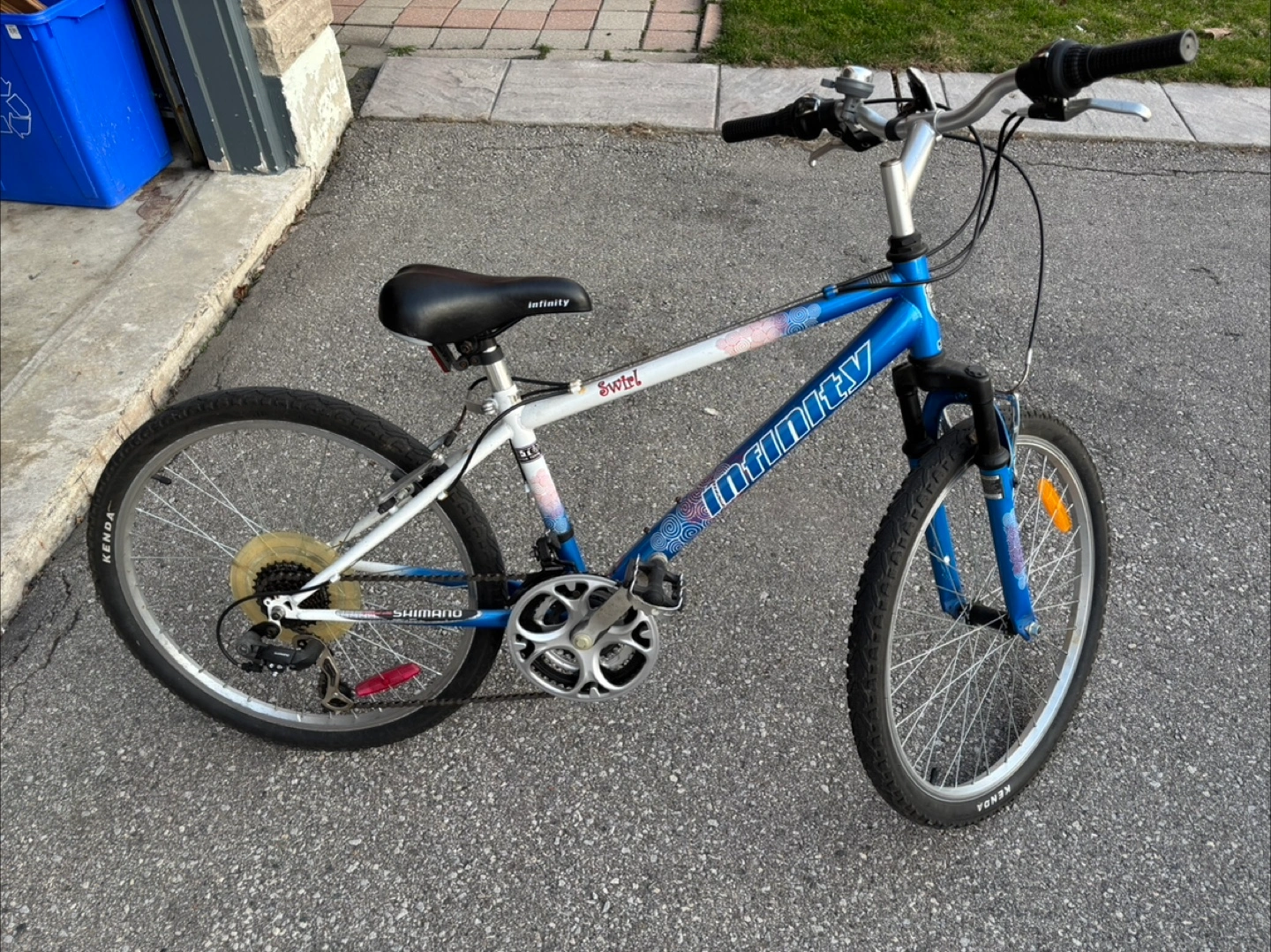 Used girls' mountain bike. Blue and white colour scheme. 24-inch wheels. Shimano components. Includes a bell.
