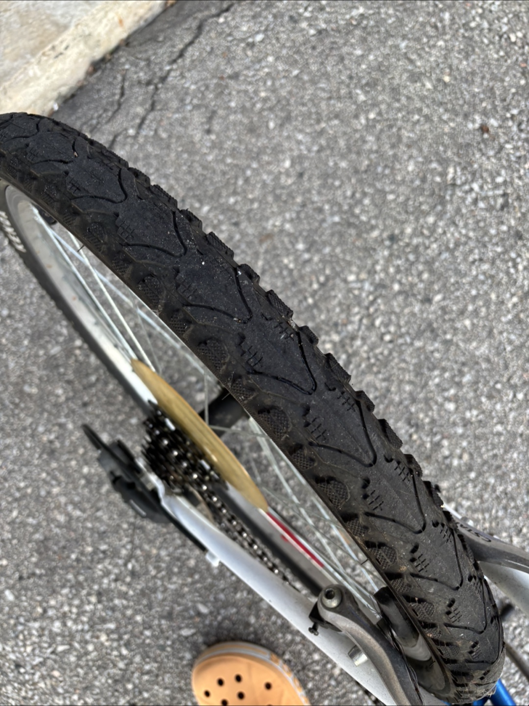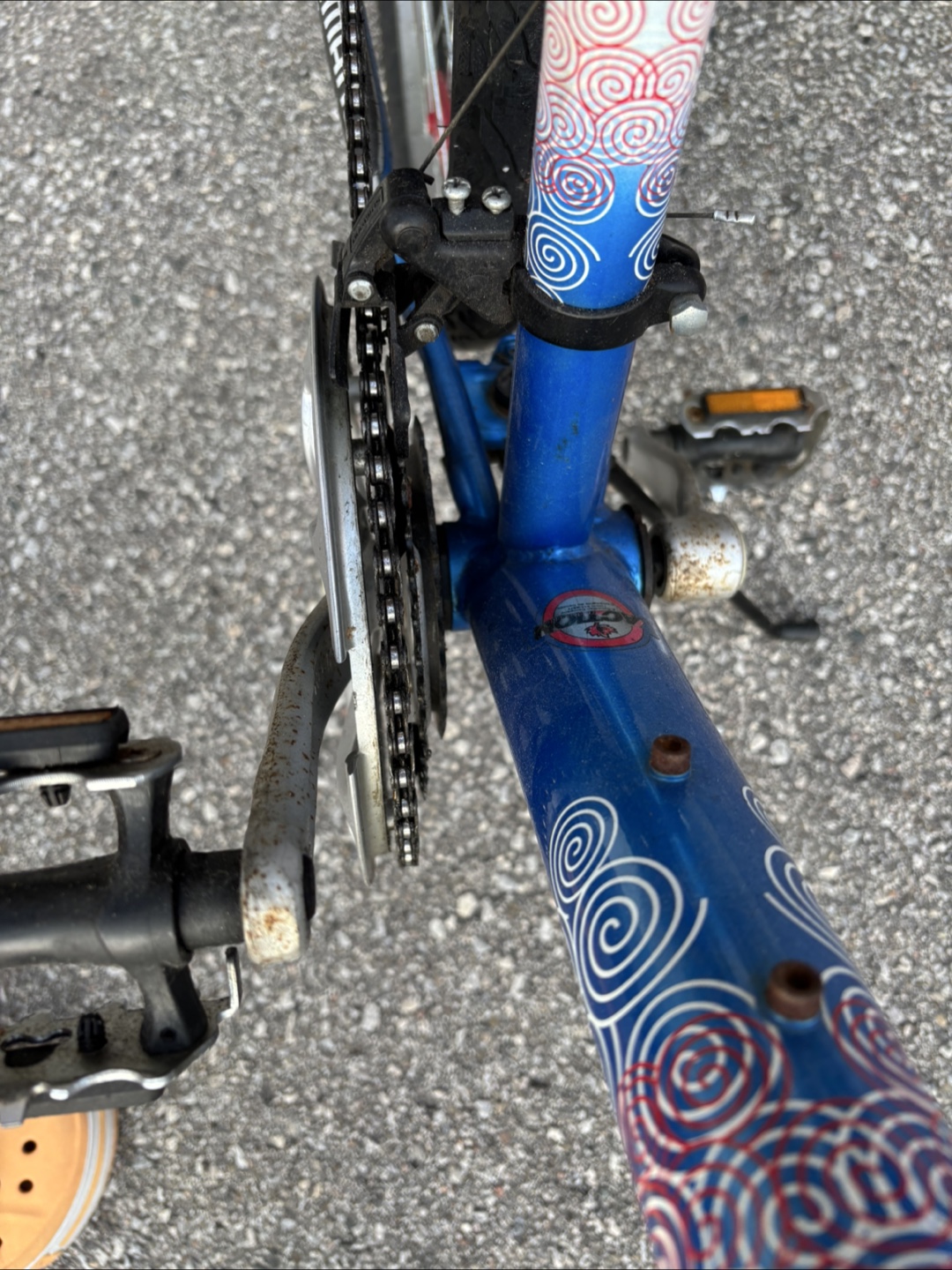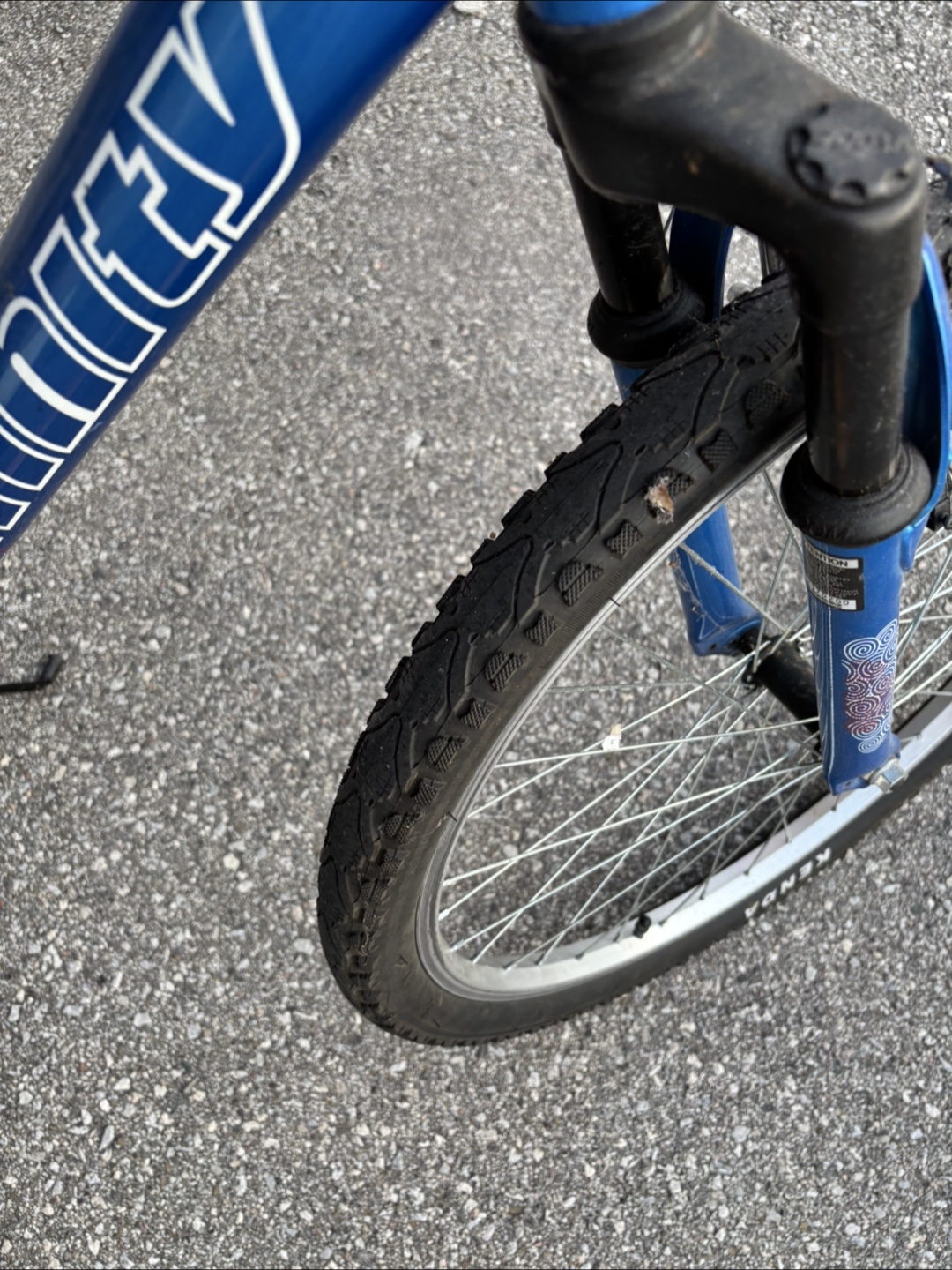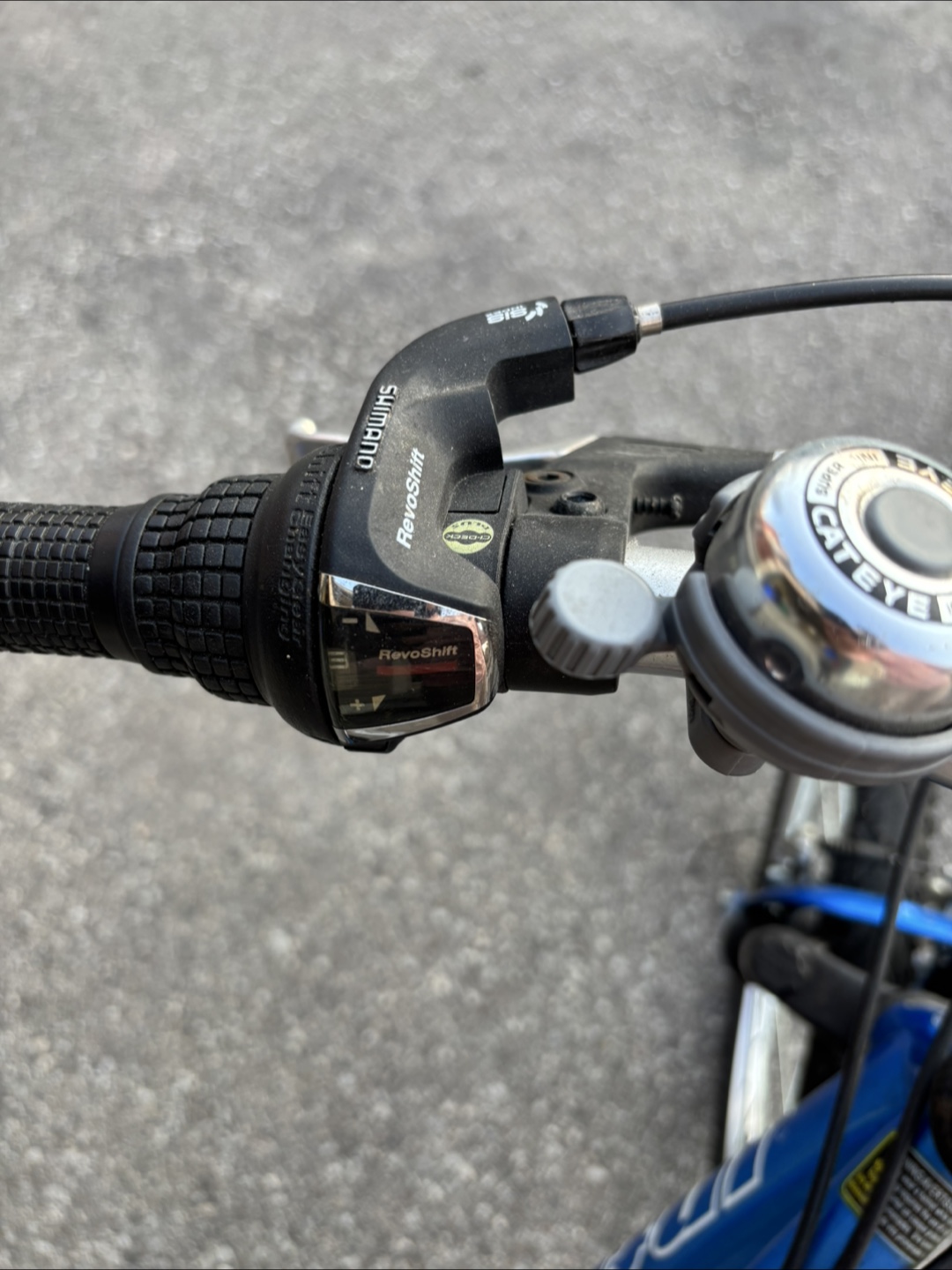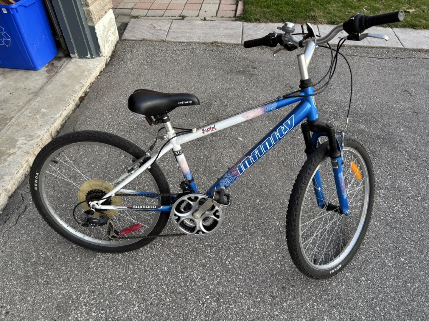 Used girls' mountain bike. Blue and white colour scheme. 24-inch wheels. Shimano components. Includes a bell.