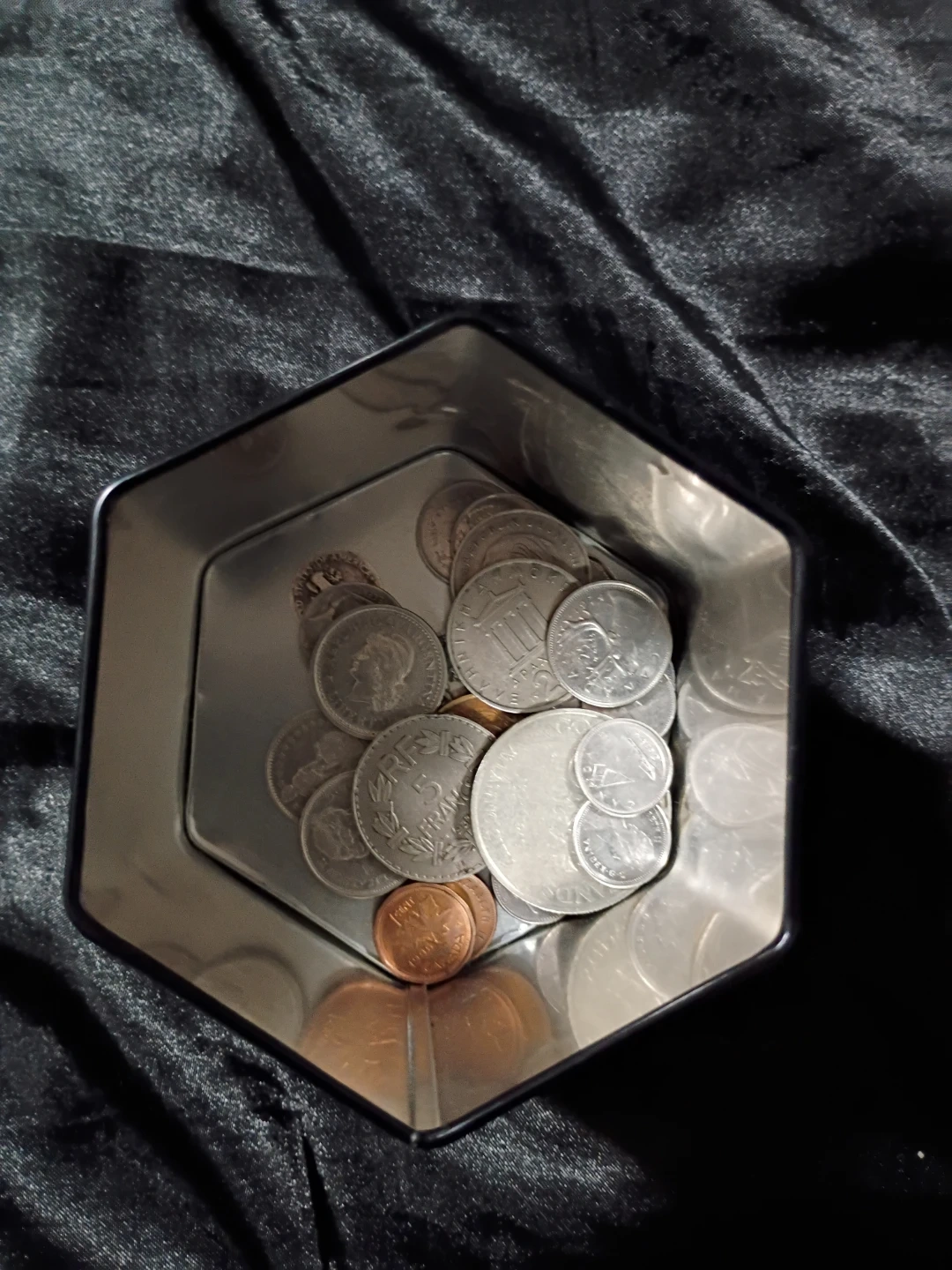 This listing features a collection of assorted coins and a banknote stored in a hexagonal tin. It's a mix of different denominations and possibly origins. The tin itself is metallic and has a unique shape.