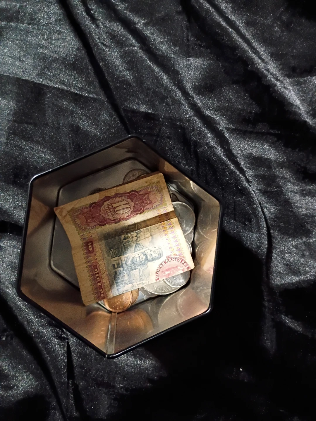 Collection of Coins and Banknote in Hexagonal Tin