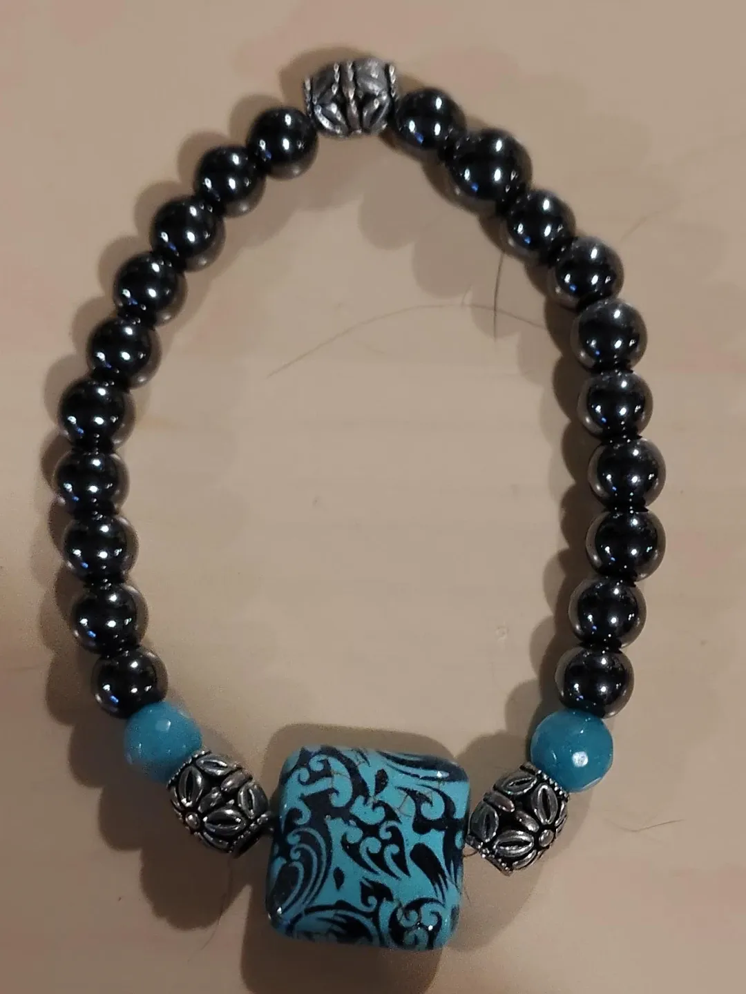 Bracelet features smooth hematite beads and bright turquoise accent beads. It includes a central square bead with a black tribal design. This beaded bracelet is stretchy and comfortable to wear.
