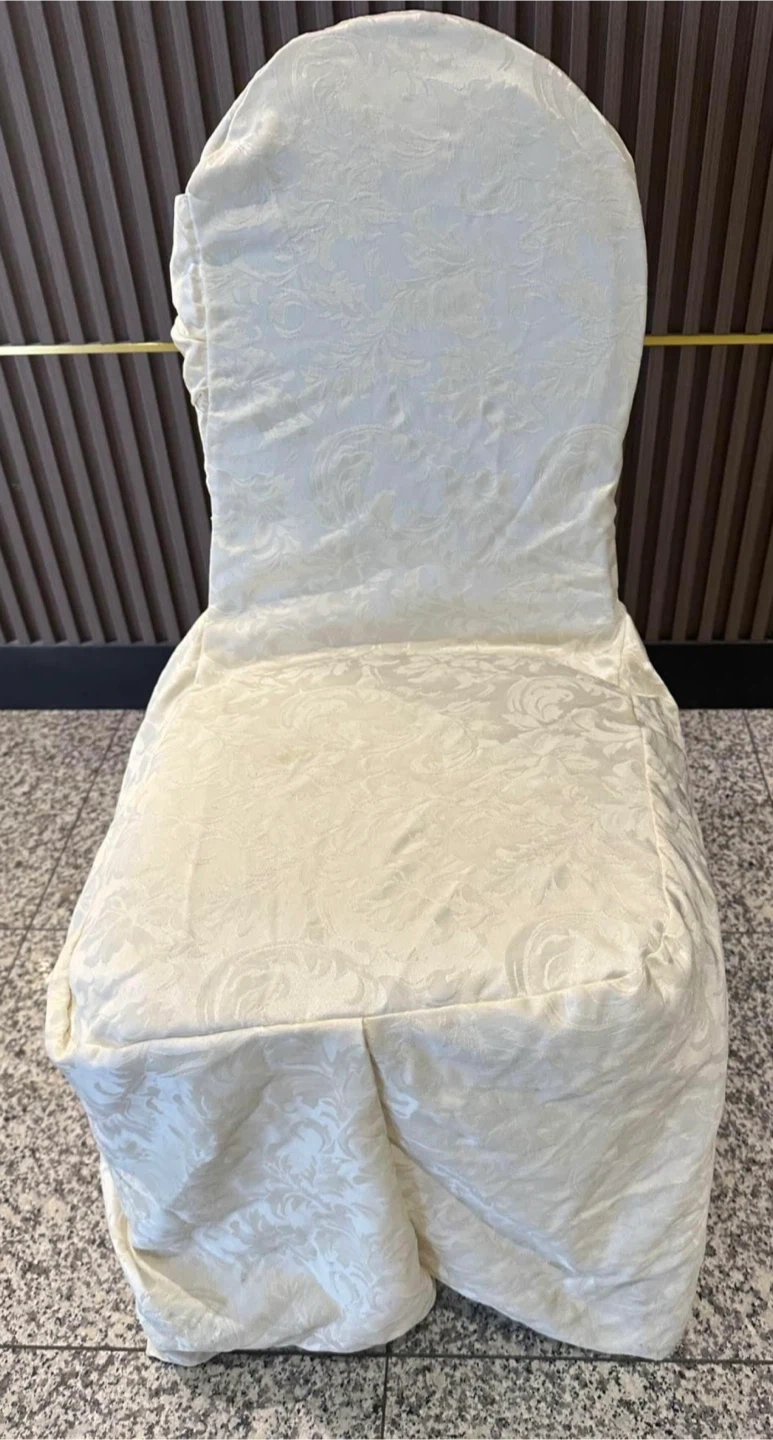 Add a touch of elegance to your event with these ivory chair covers, designed to fit standard banquet chairs. These chair covers are in used condition. They feature a subtle floral pattern that adds a sophisticated and timeless look to any setting. Perfect for weddings, parties, or corporate events, they will transform ordinary chairs into stylish seating.