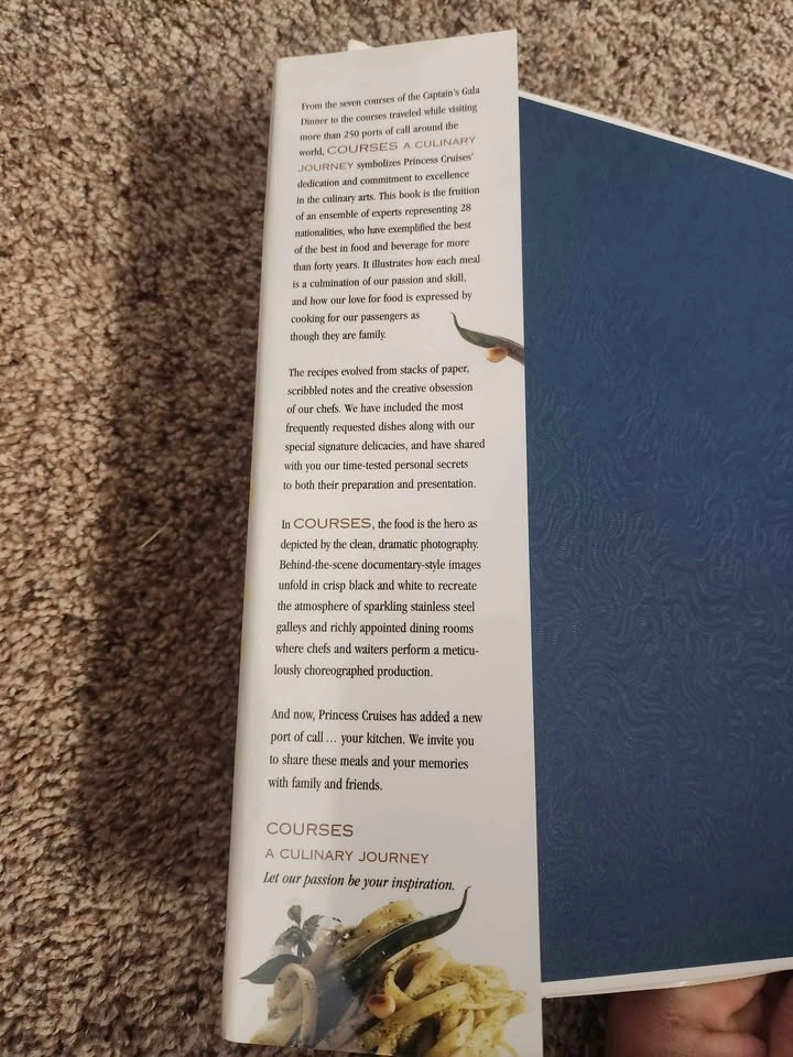 Cookbook from Princess Cruises outlining the most asked for meals served on the ships, complete with recipes. Let me know if you're interested!