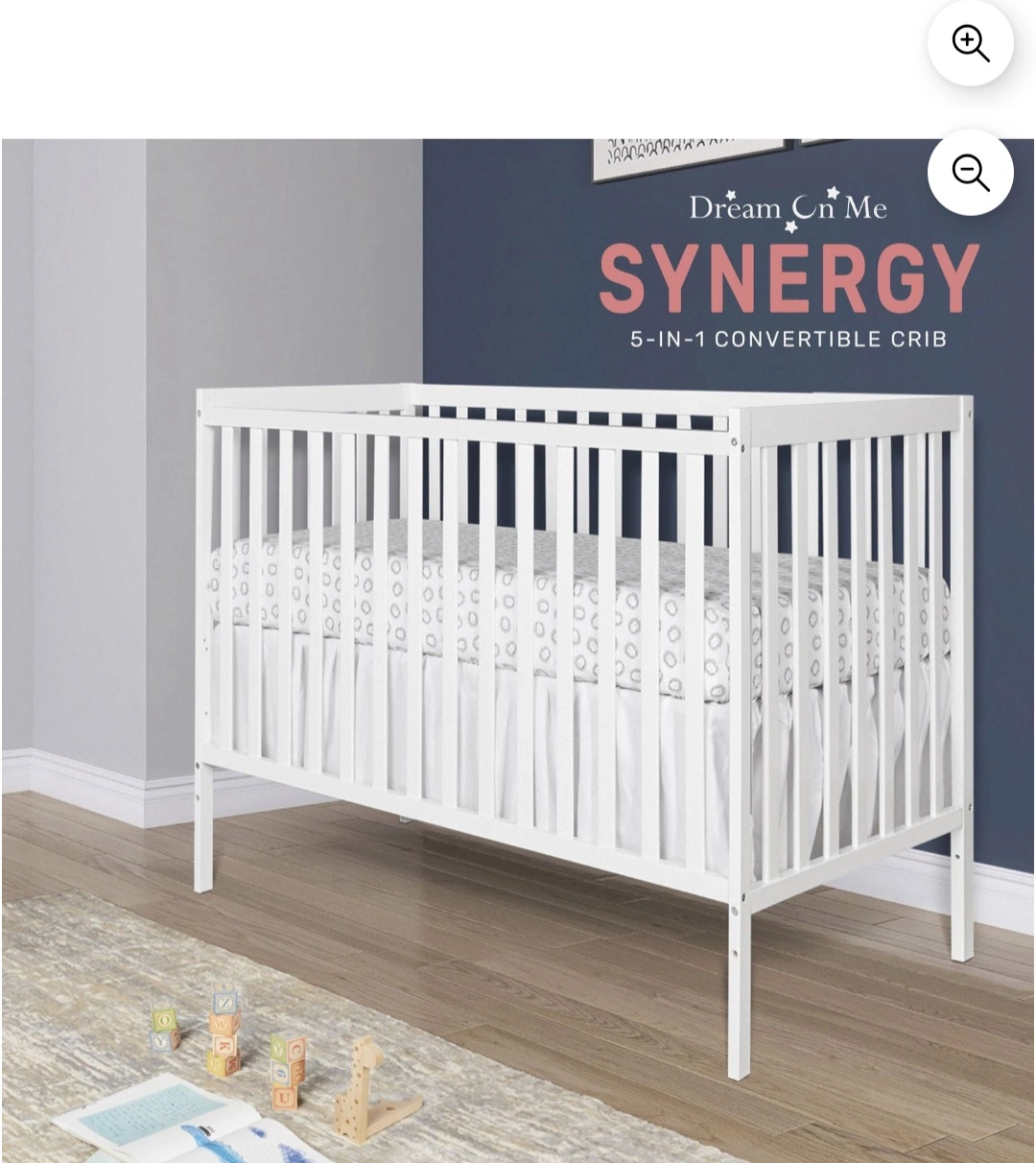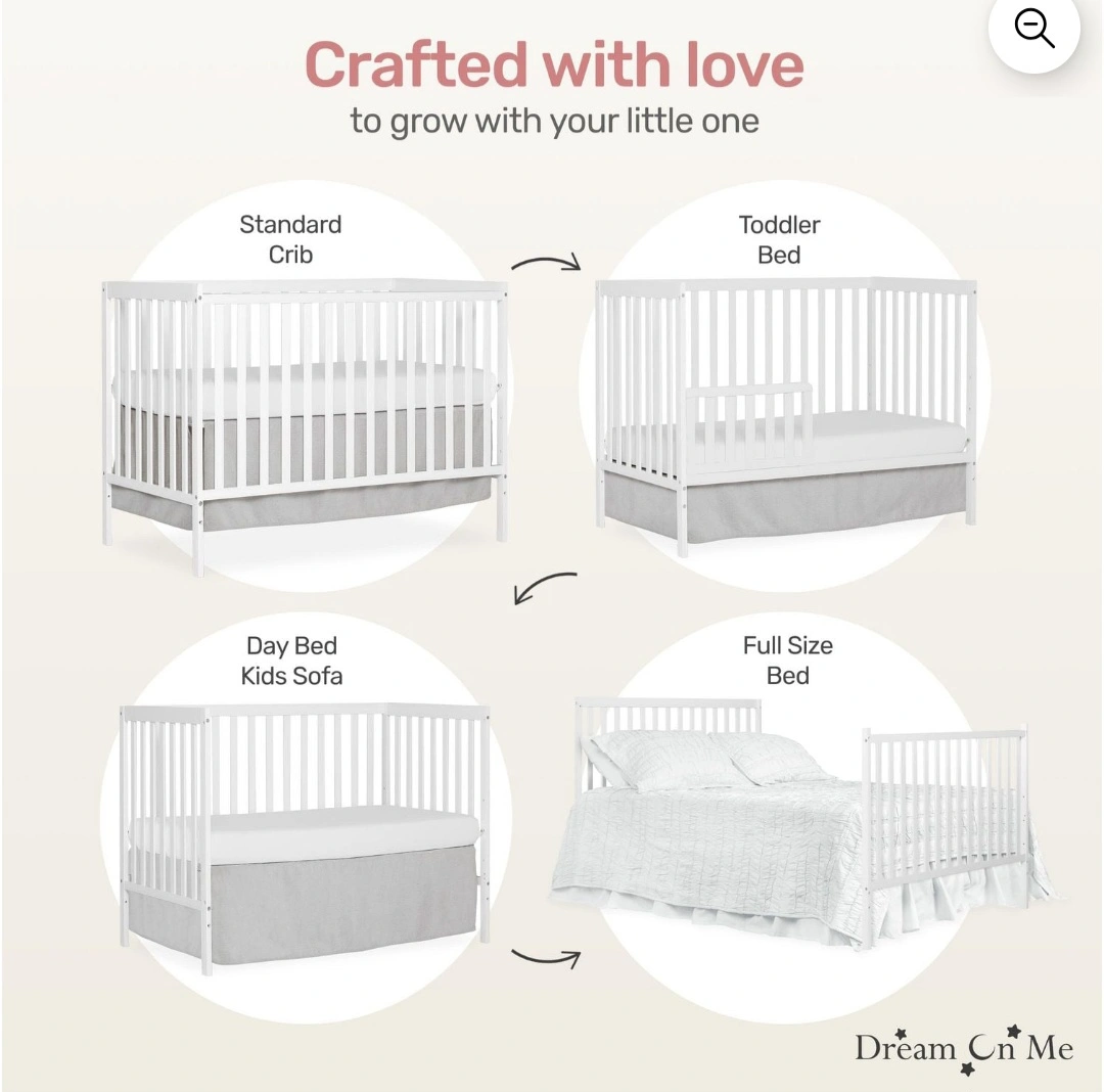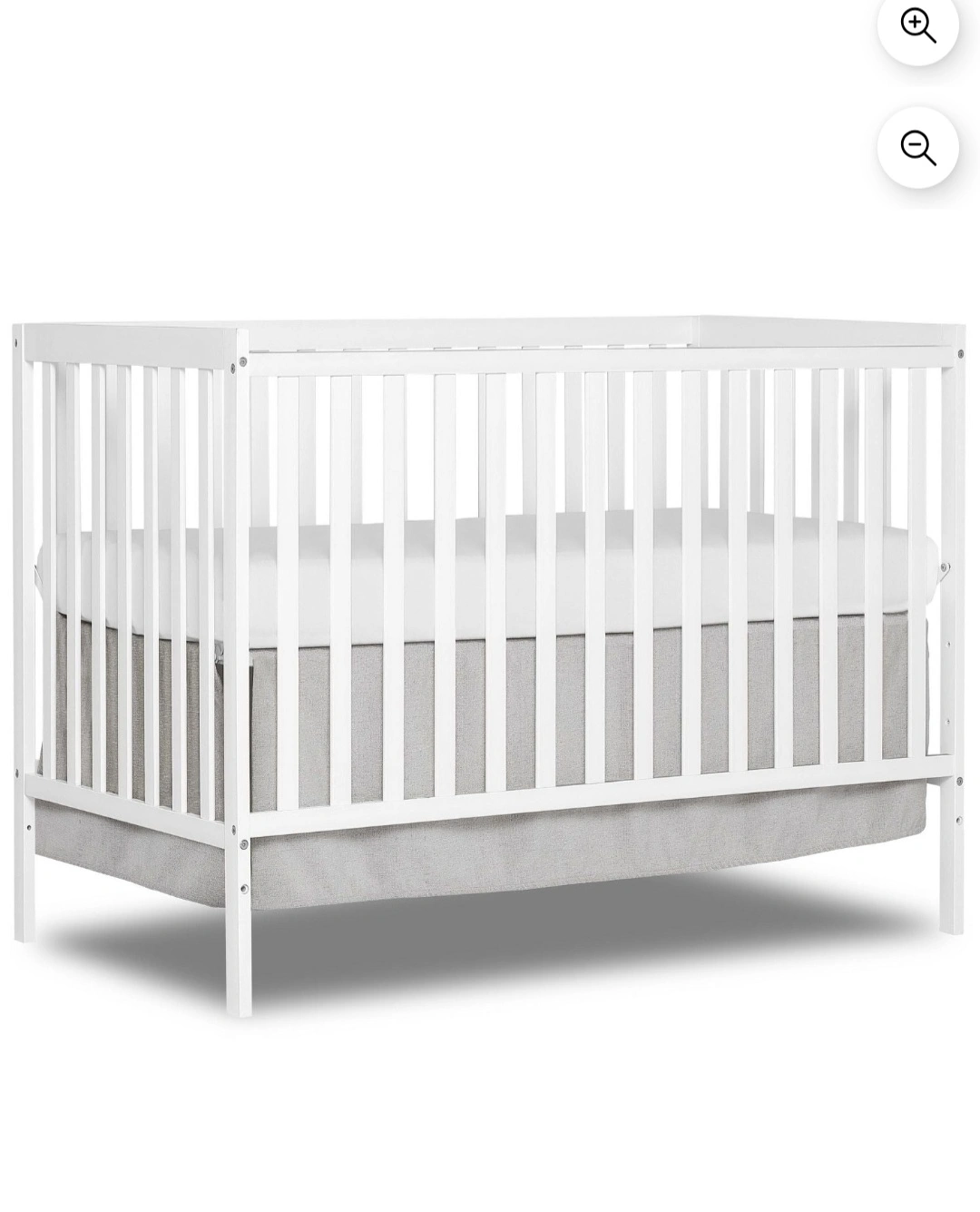 A white crib with a skirt. It has vertical slats on the sides and a simple design. Consider it a calming space for your little one to rest in. It is a 5-in-1 convertible crib.