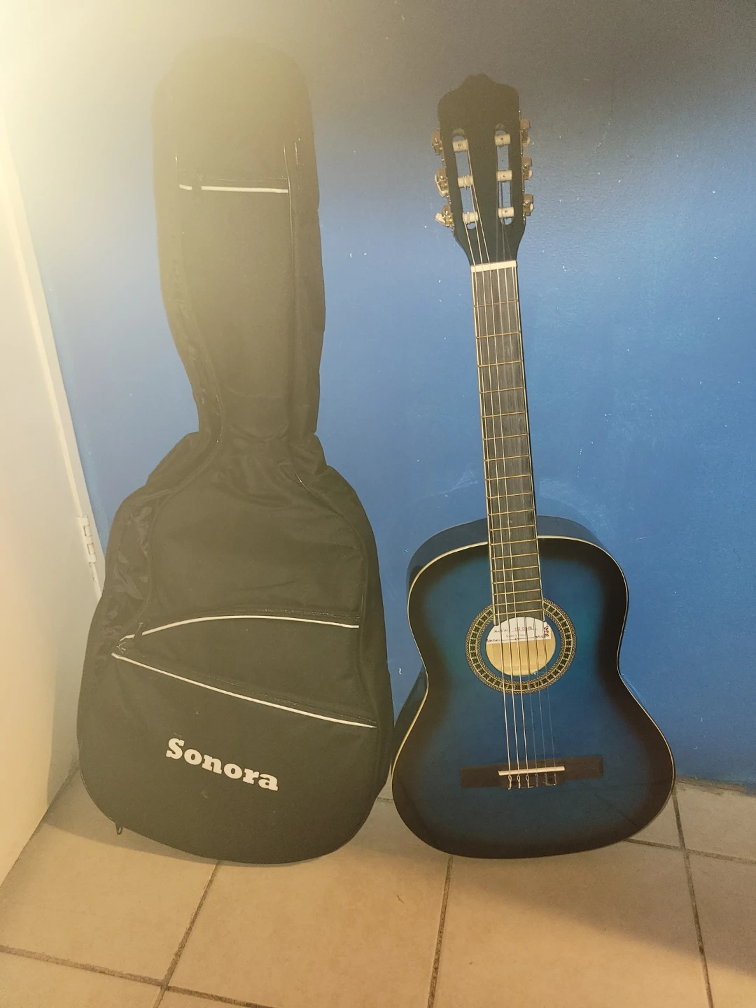 Selling a blue Sonora acoustic guitar. It comes with a case for easy transport and storage. Great for beginners or anyone looking for a reliable instrument!
