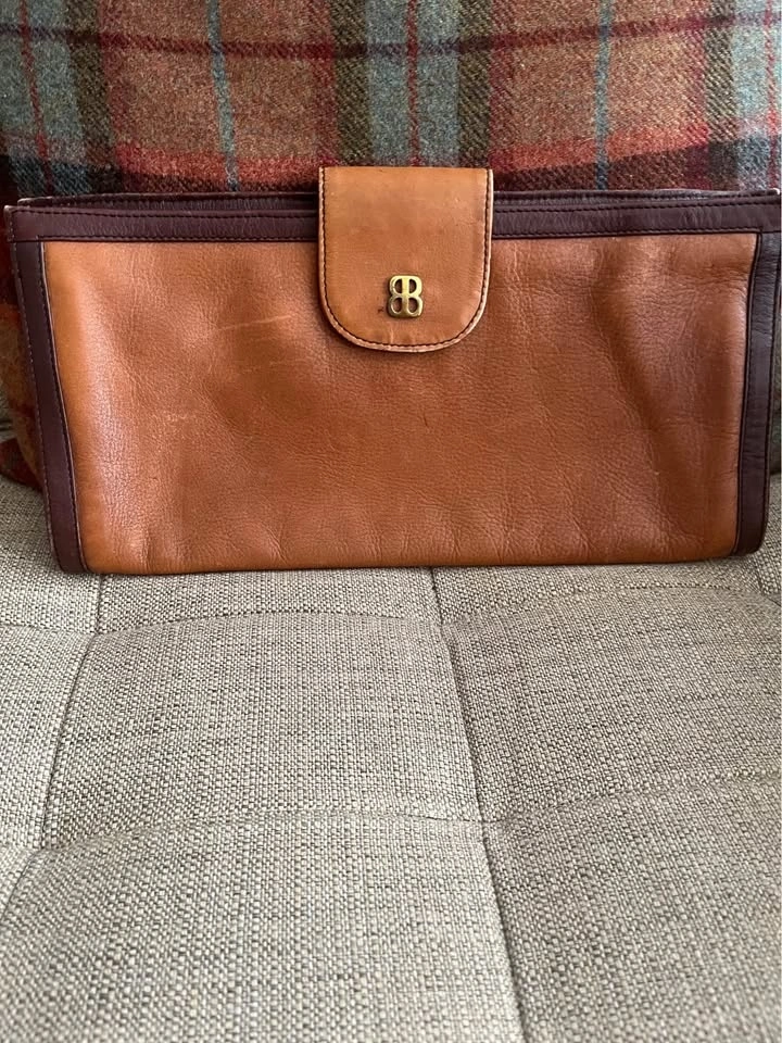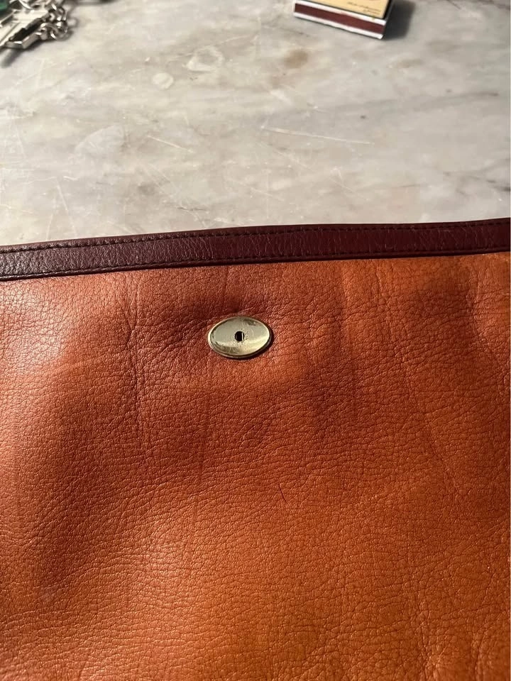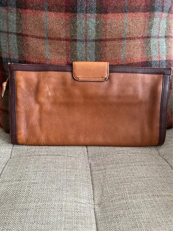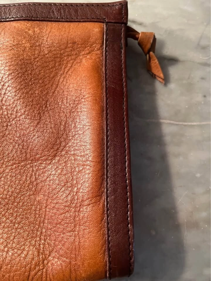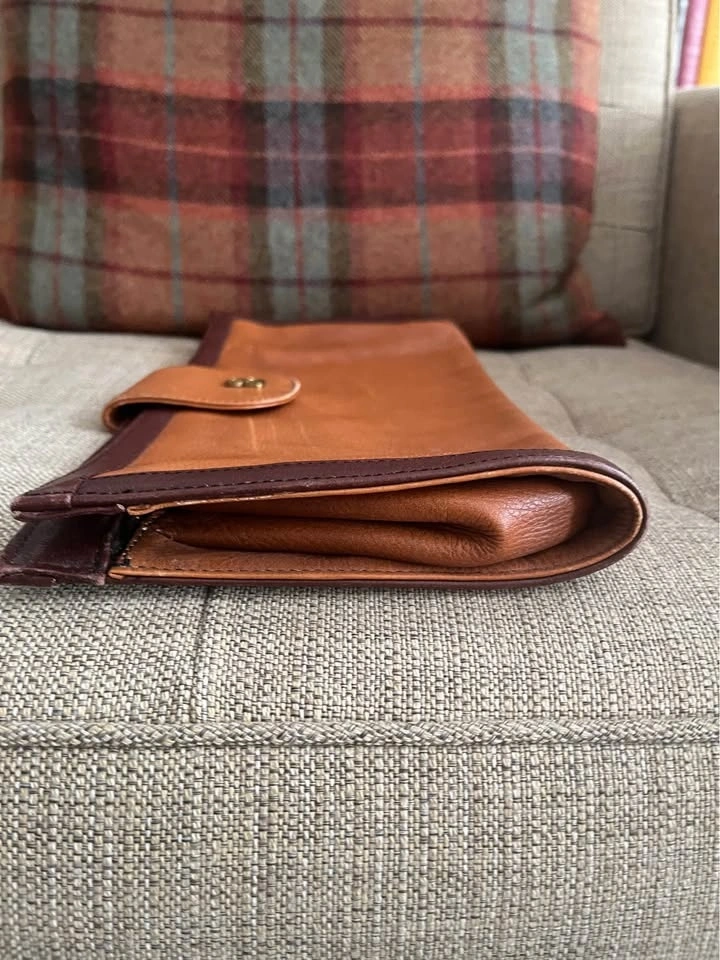 Gold/ Brass Snap Closure as well as top zip. Supple leather with nice patina. Clutch is nicely framed with accent leather. Black cloth lining with zippered interior pocket. Size: 13 1/2 inches wide by 7 inches roughly. Pick up on Ontario Street. Cash only.