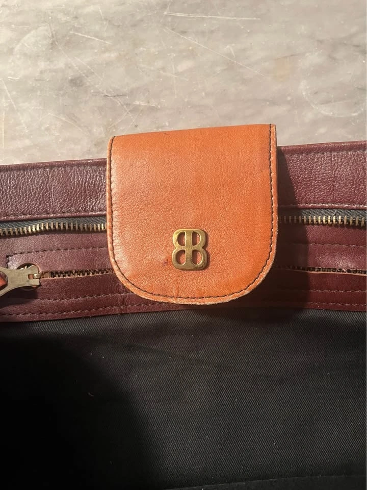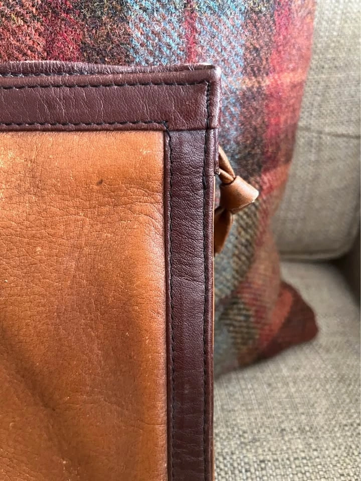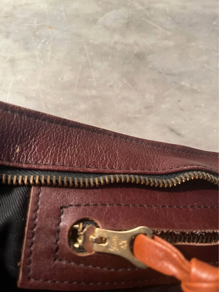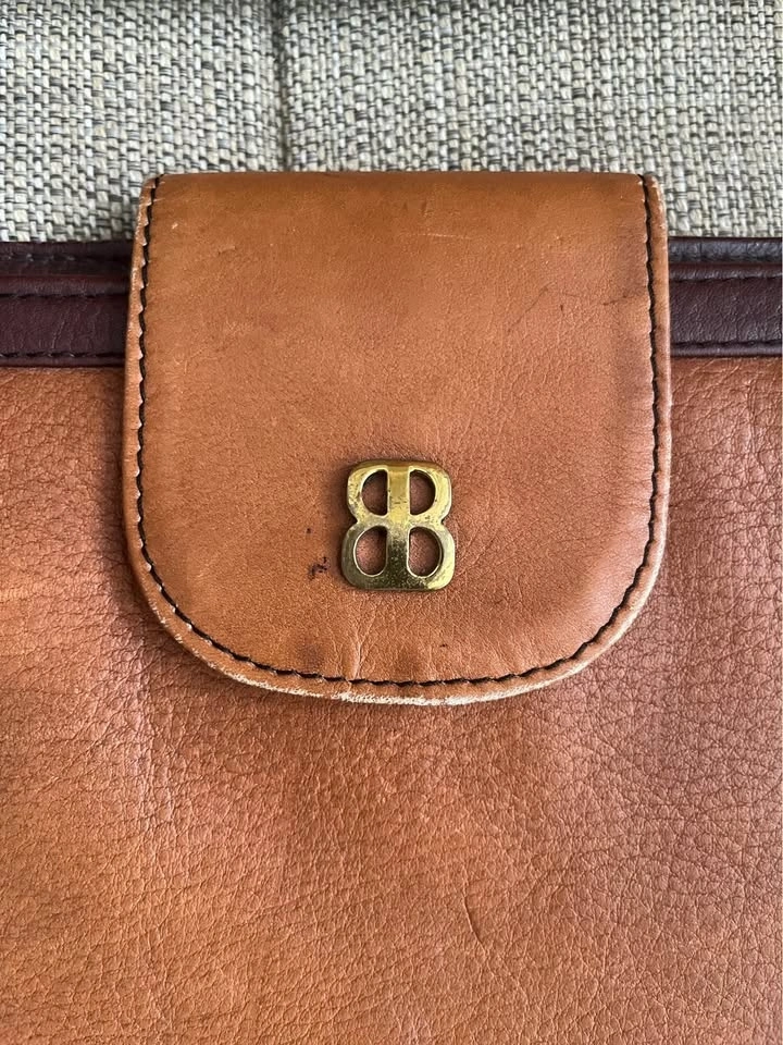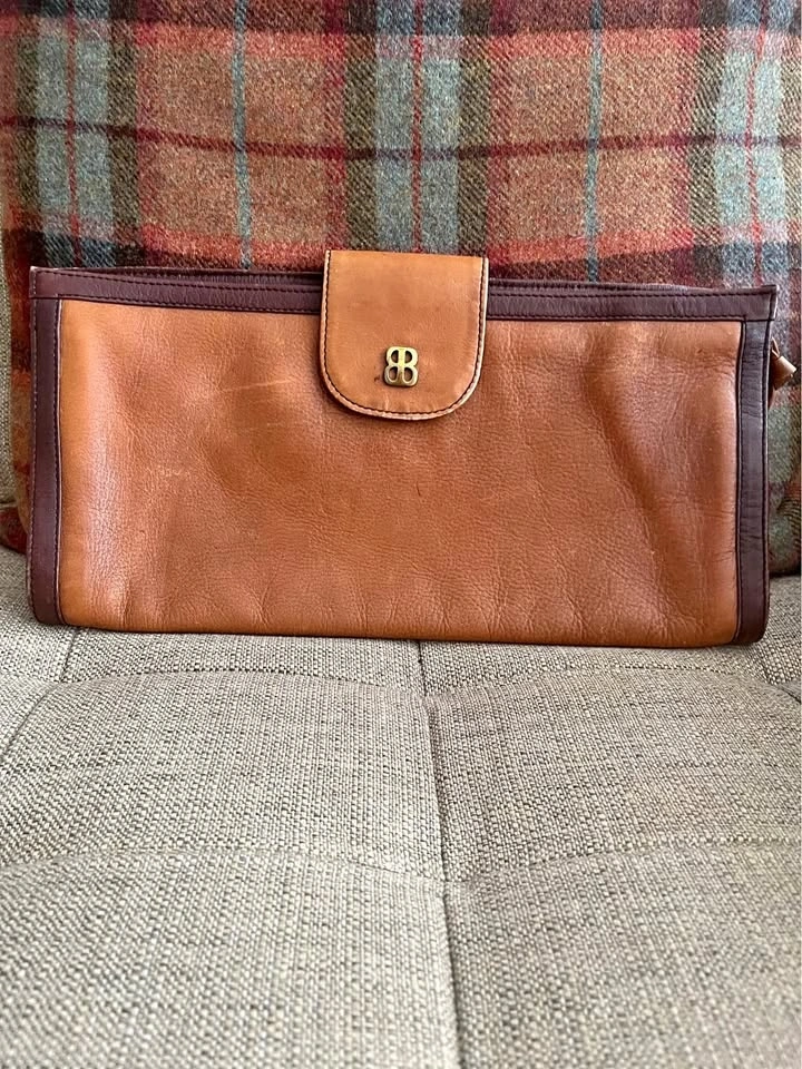 Gold/ Brass Snap Closure as well as top zip. Supple leather with nice patina. Clutch is nicely framed with accent leather. Black cloth lining with zippered interior pocket. Size: 13 1/2 inches wide by 7 inches roughly. Pick up on Ontario Street. Cash only.