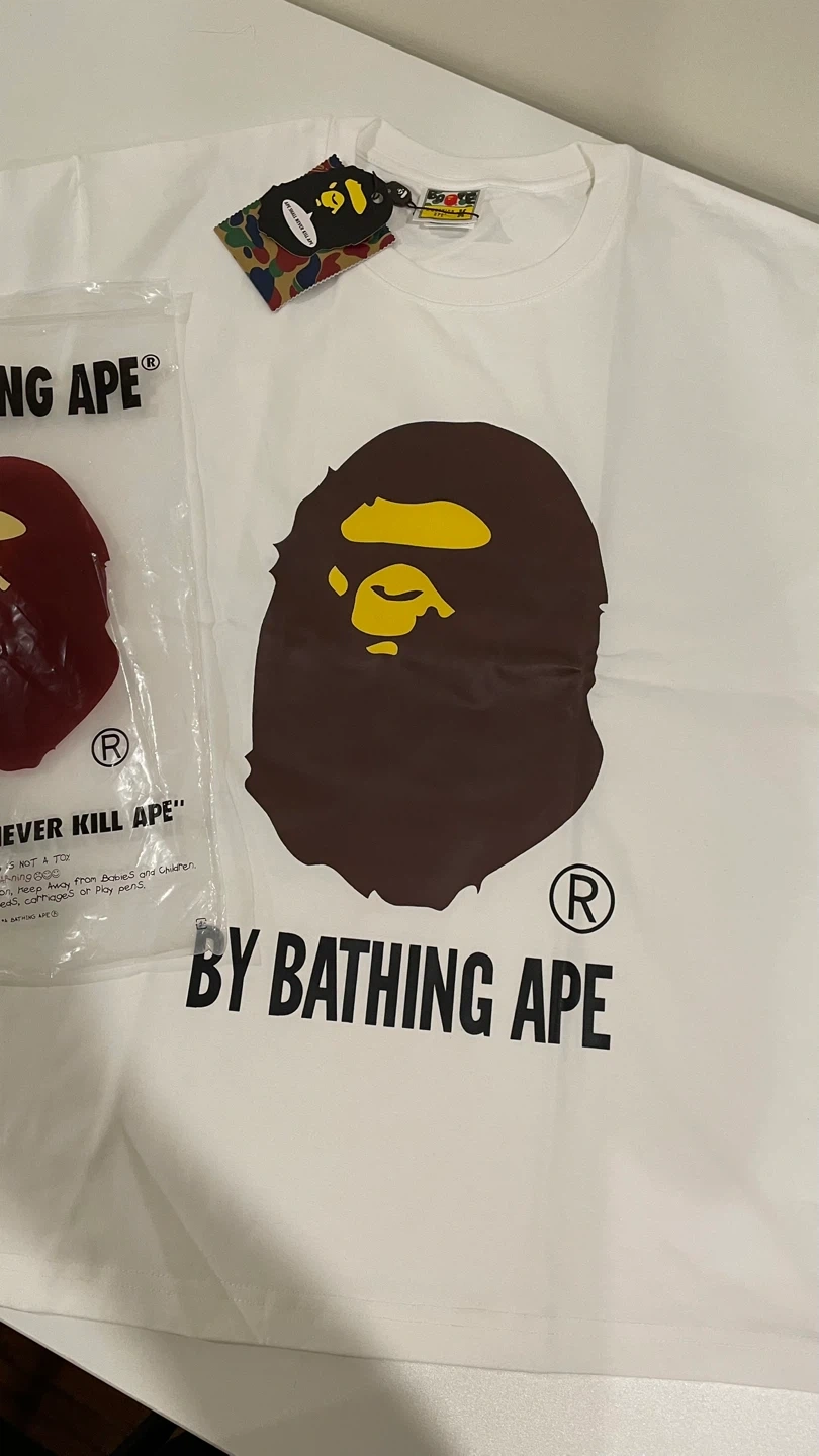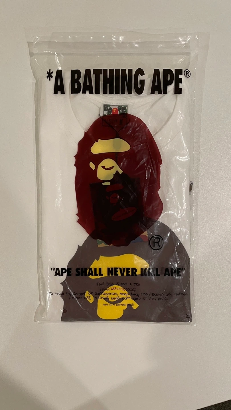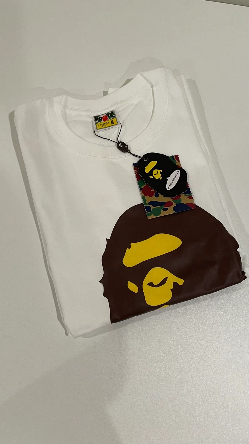 This is a white A Bathing Ape t-shirt featuring the iconic Big Ape Head graphic in brown and yellow. It's a size medium and comes in its original packaging with tags. Cotton material.