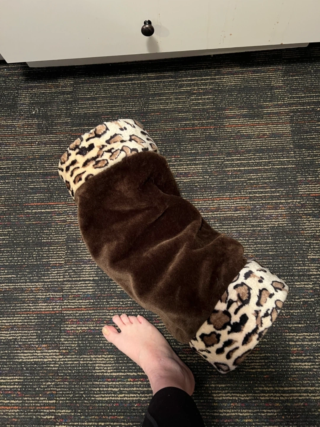 Brown plush cat tunnel with leopard print trim. It's made of soft material for your furry friend's comfort. This tunnel provides a fun place for cats to play and hide. The compact design makes it easy to store when not in use.