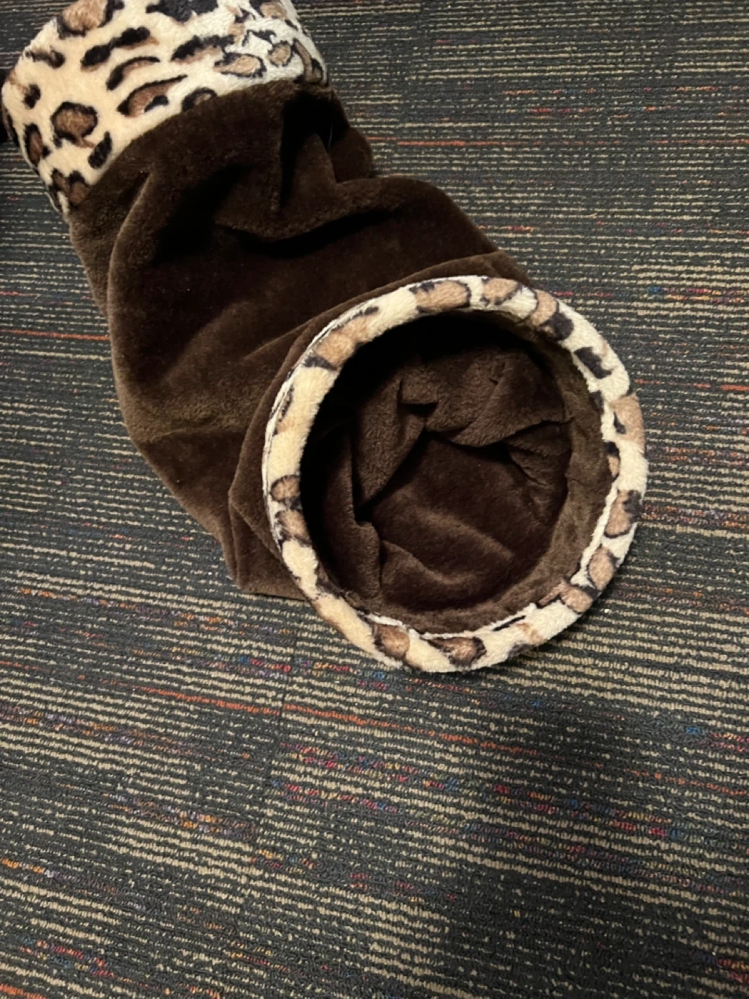Brown plush cat tunnel with leopard print trim. It's made of soft material for your furry friend's comfort. This tunnel provides a fun place for cats to play and hide. The compact design makes it easy to store when not in use.