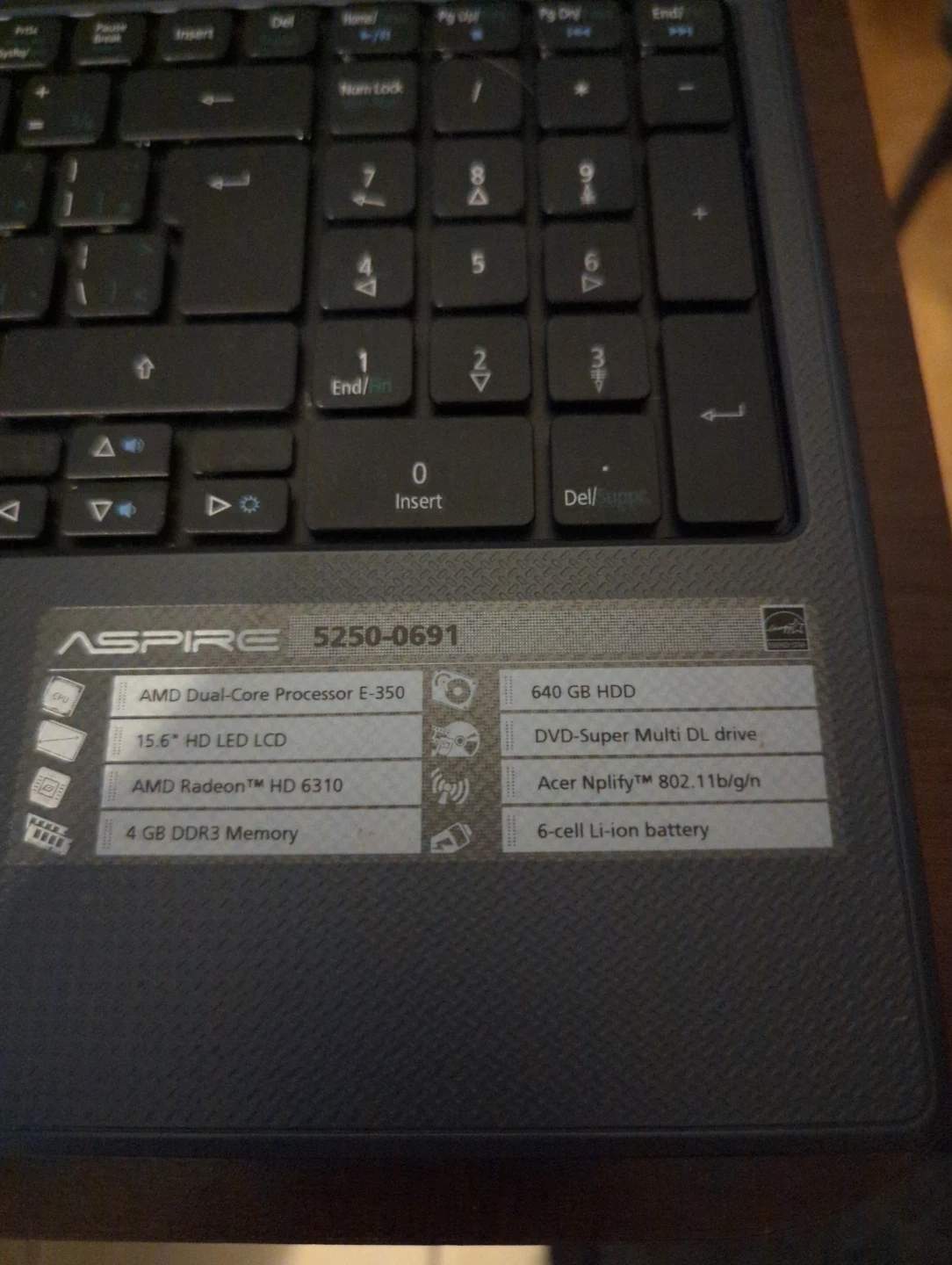 Acer Aspire laptop with a 15.6" HD LED LCD. It's powered by an AMD Dual-Core Processor E-350 and has 4 GB DDR3 Memory. Storage includes a 640 GB HDD and a DVD-Super Multi DL drive. It also features Acer Nplify 802.11b/g/n and a 6-cell Li-ion battery.