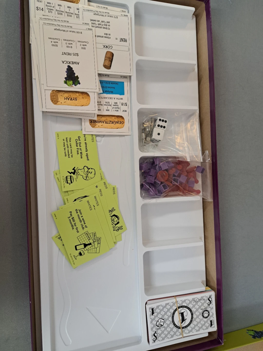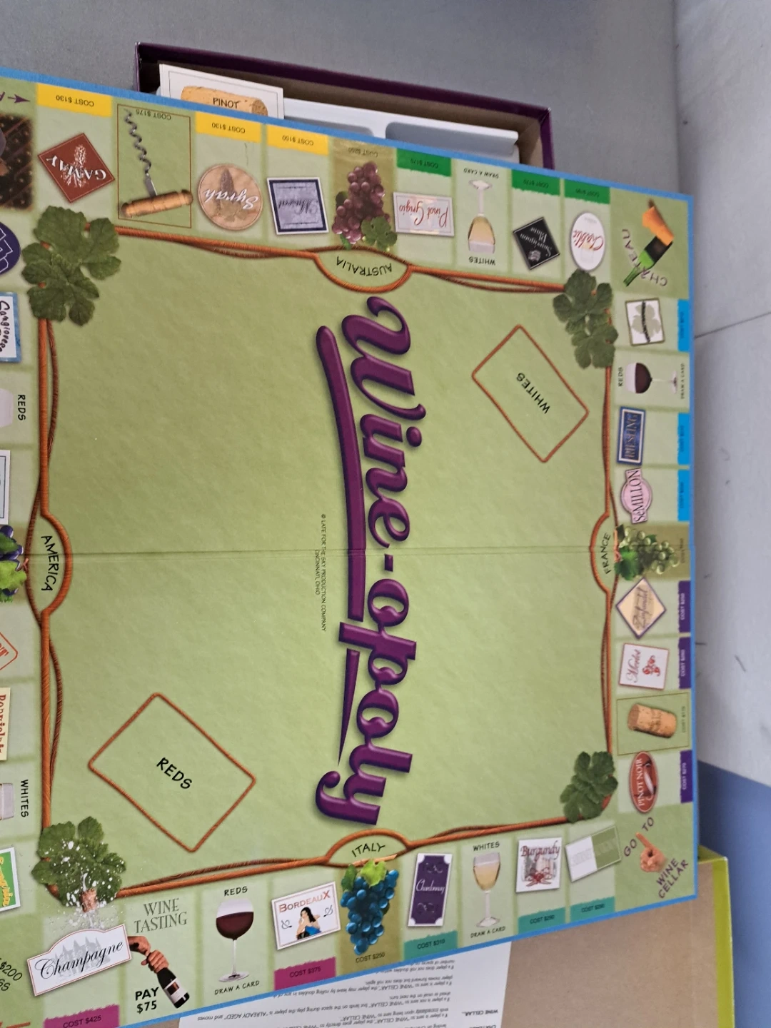 Selling a Wine-opoly board game! It includes a board, tokens, bunches of grapes, decanters, reds and whites cards, deeds, play money and dice. Get ready for a game of cork popping fun! Opened but never played so in great shape.