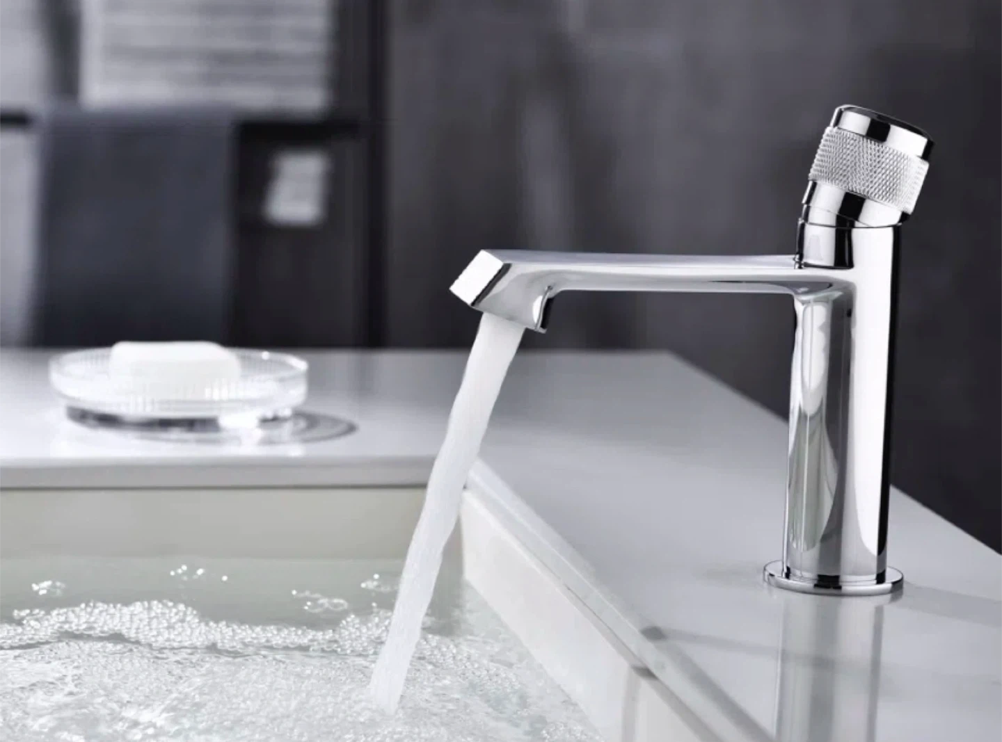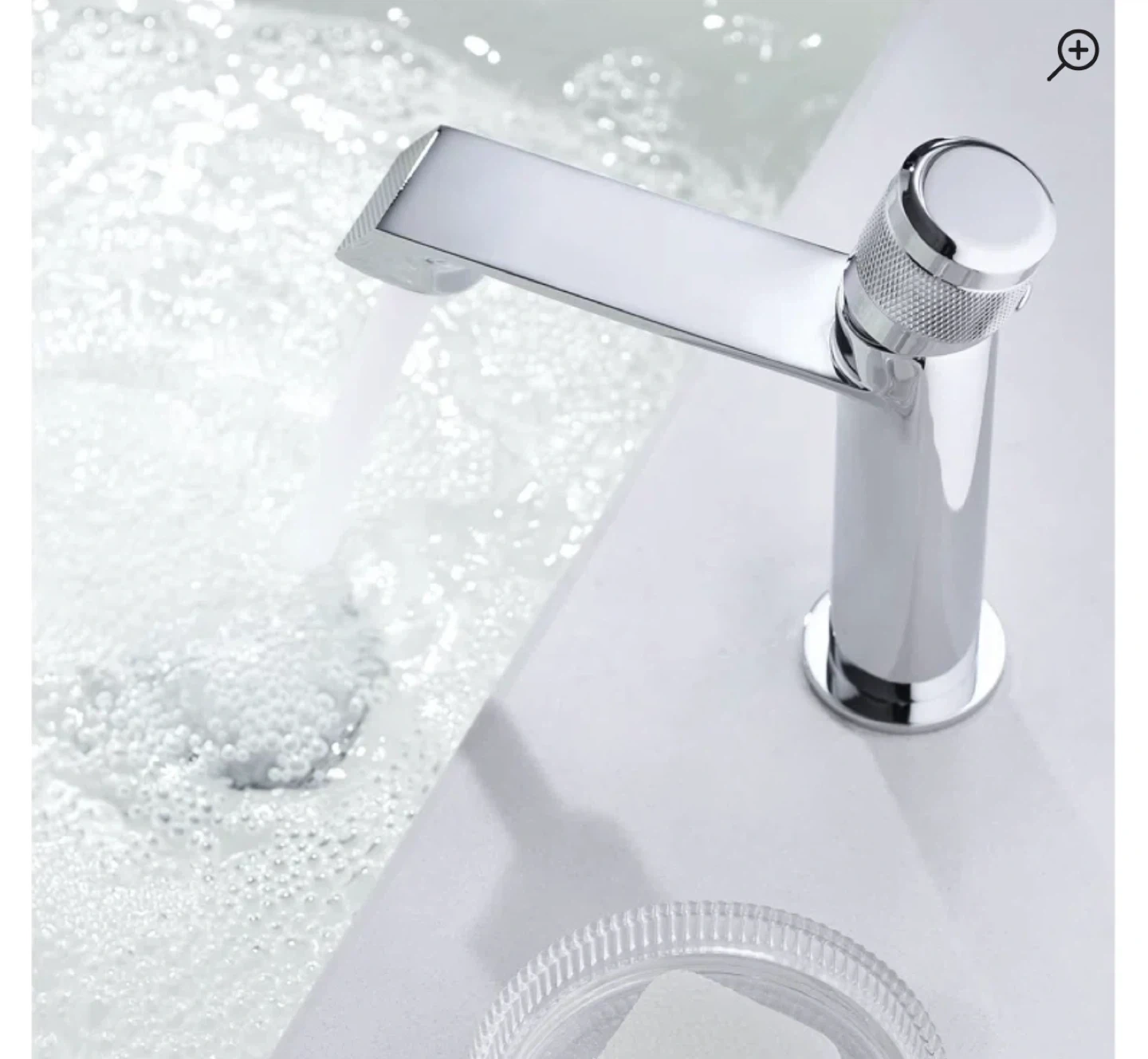 This is a modern chrome bathroom faucet. It's made of durable metal and includes a matching drain assembly. This faucet would be great for a bathroom renovation project.