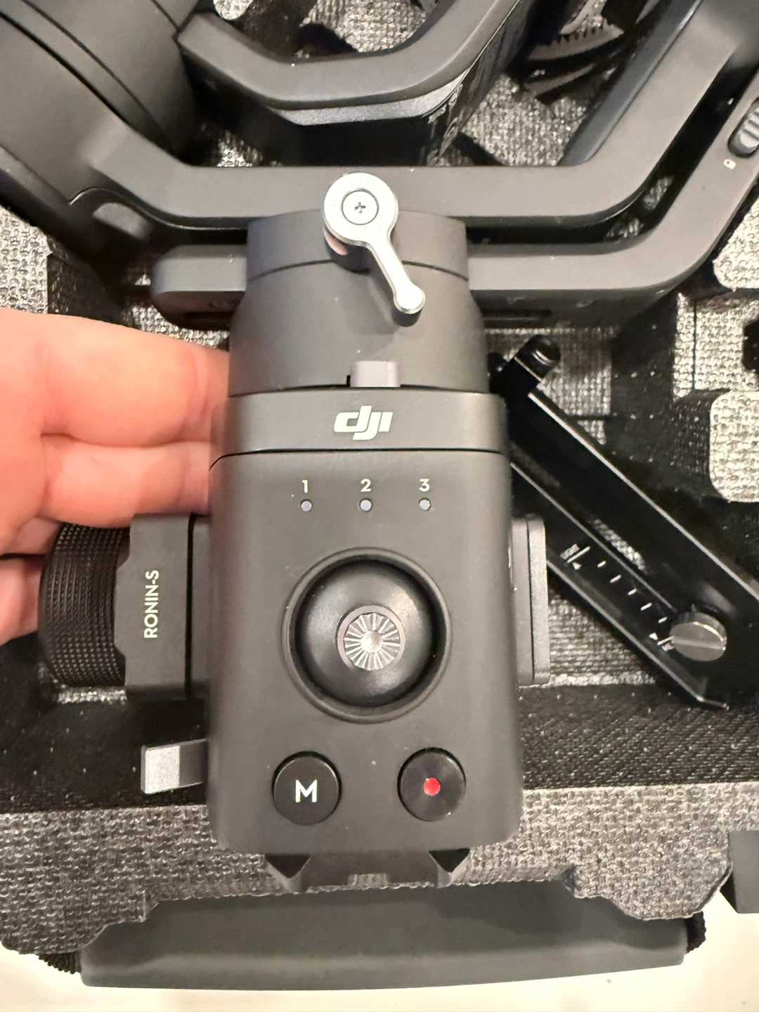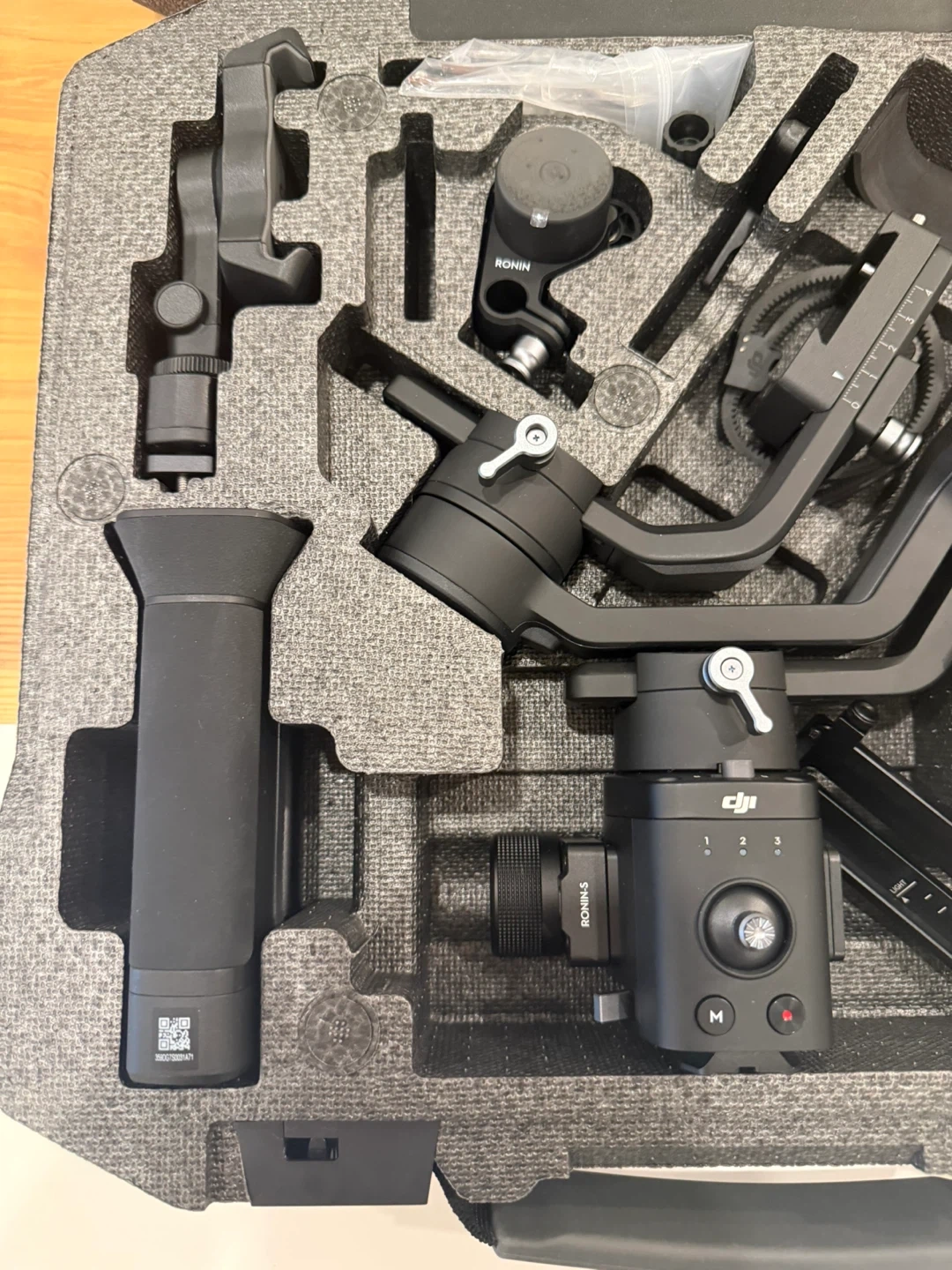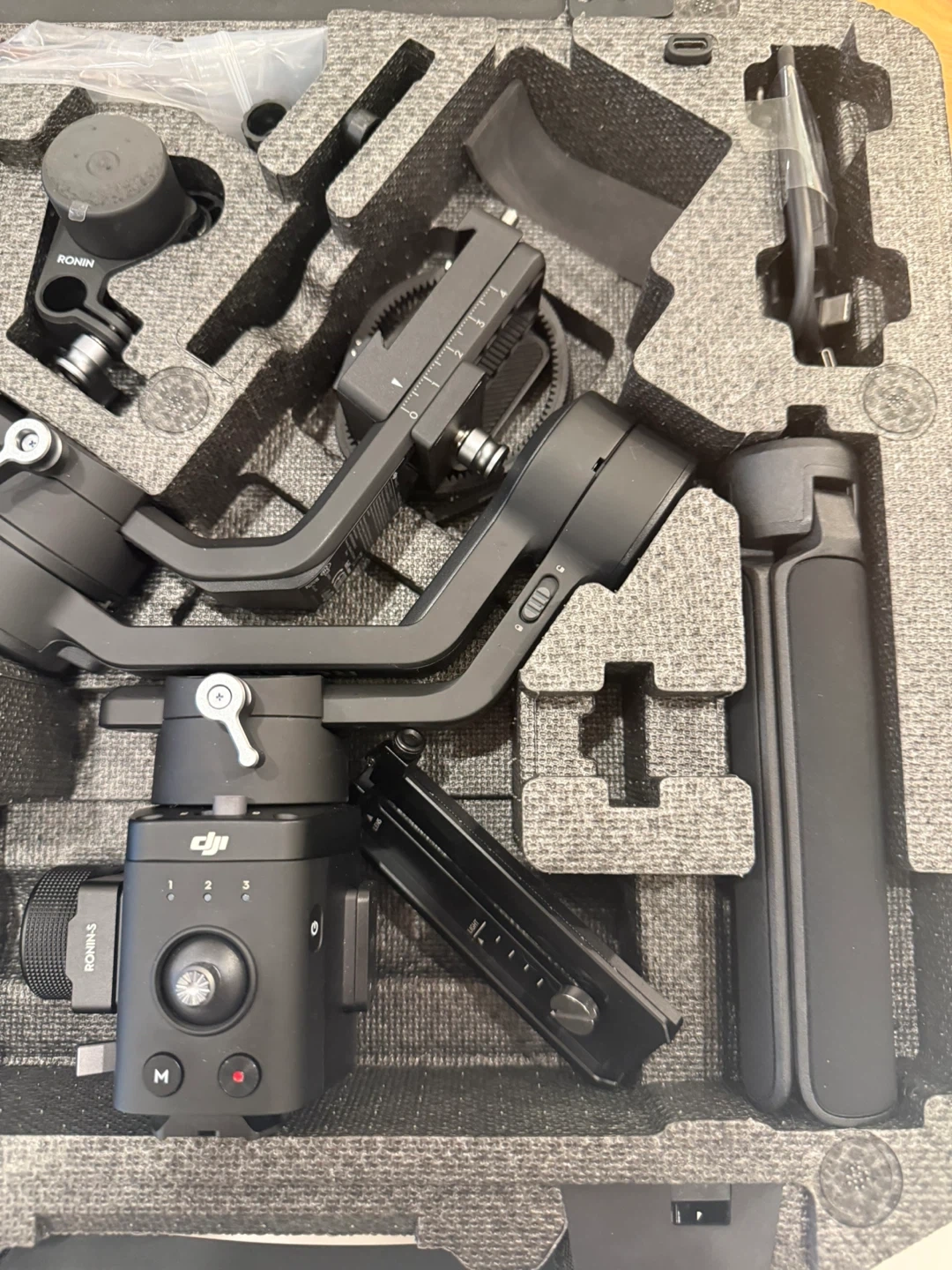This is a DJI Ronin-SC gimbal stabilizer. It's black and comes in its original case. Includes various accessories.