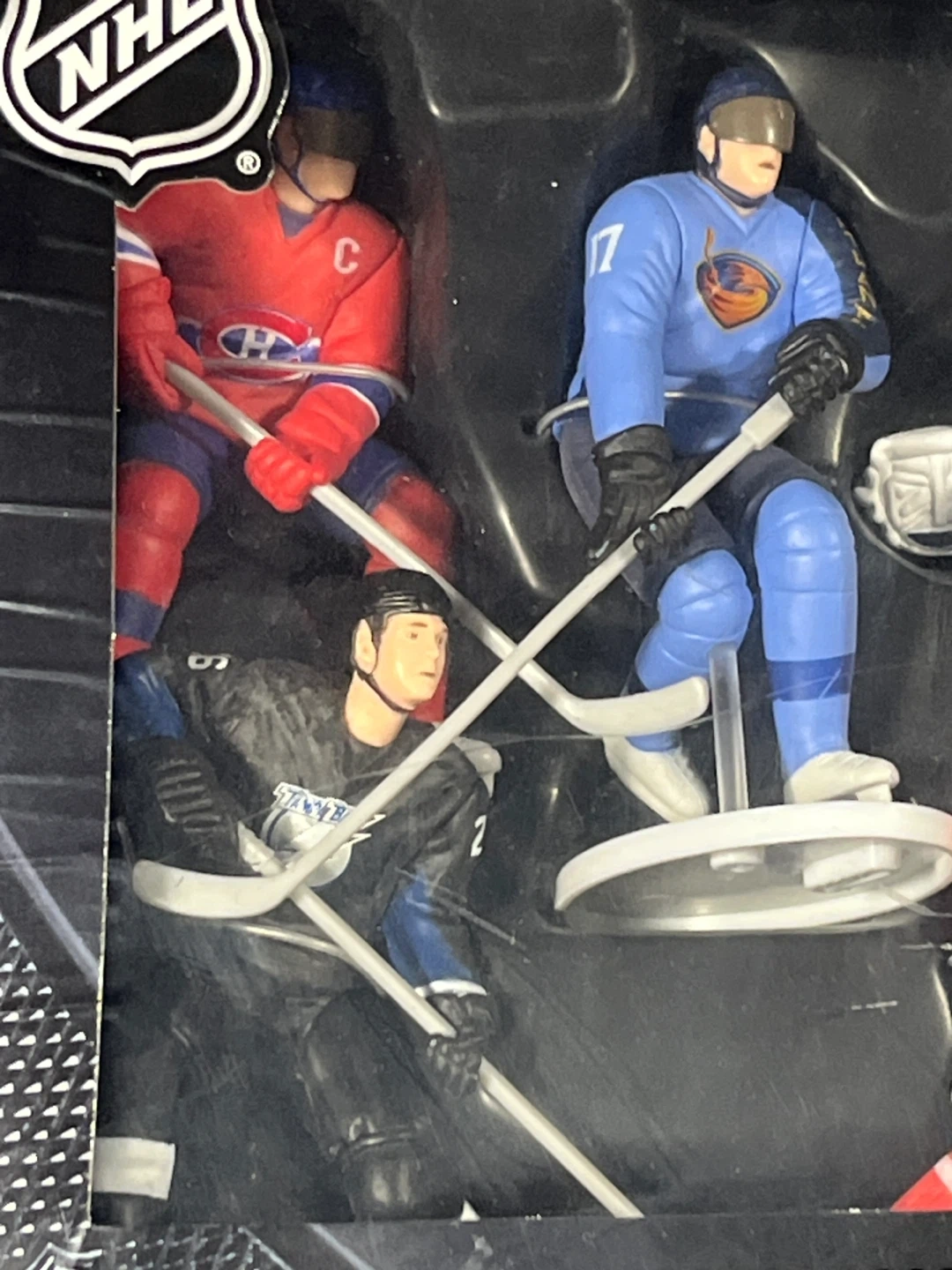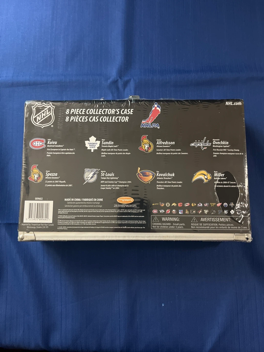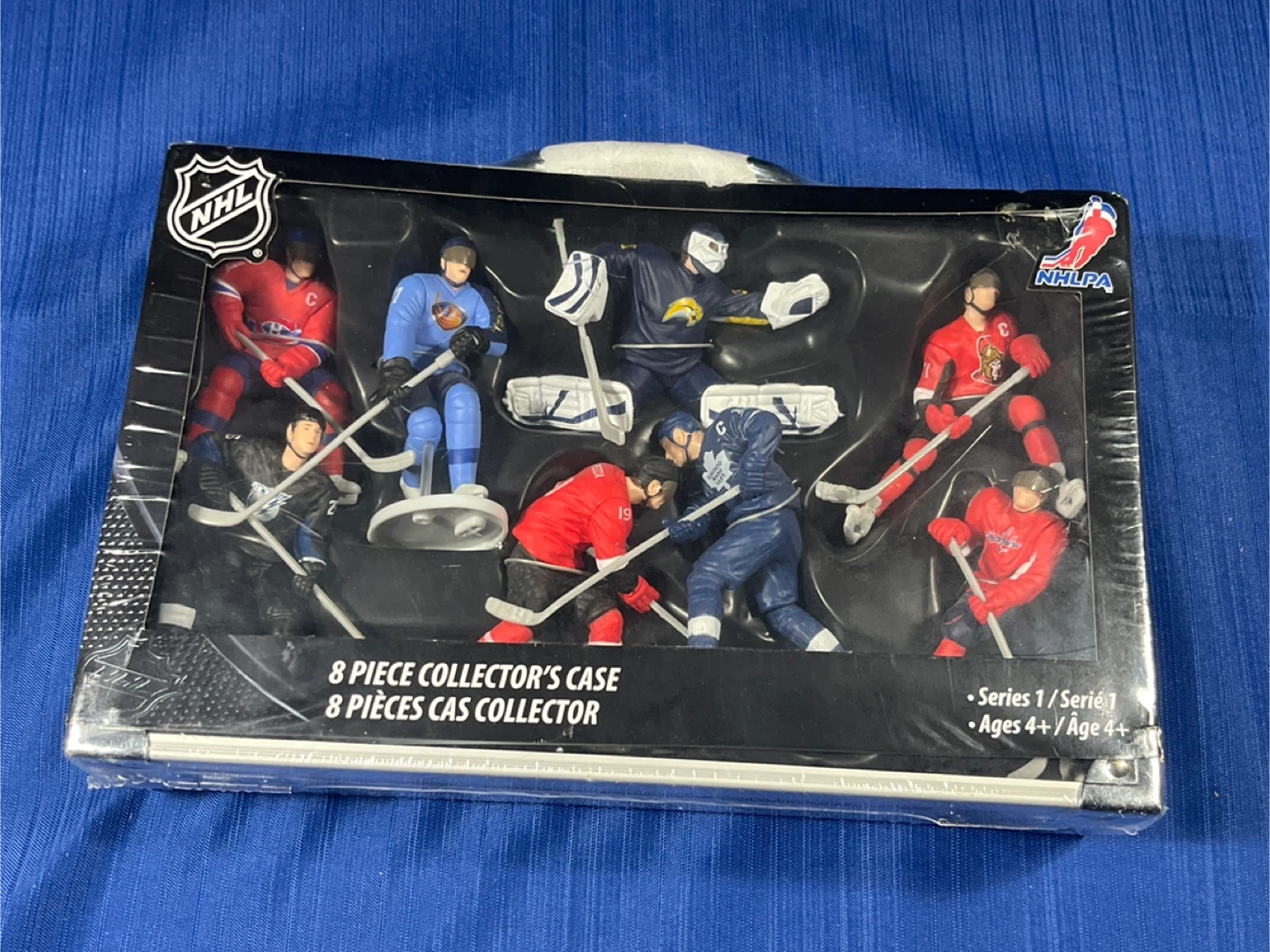 This NHL collector's case includes 8 action figures of hockey players. Figures represent players from various NHL teams like the Montreal Canadiens, Toronto Maple Leafs, and Ottawa Senators. Ages 4 and up.
