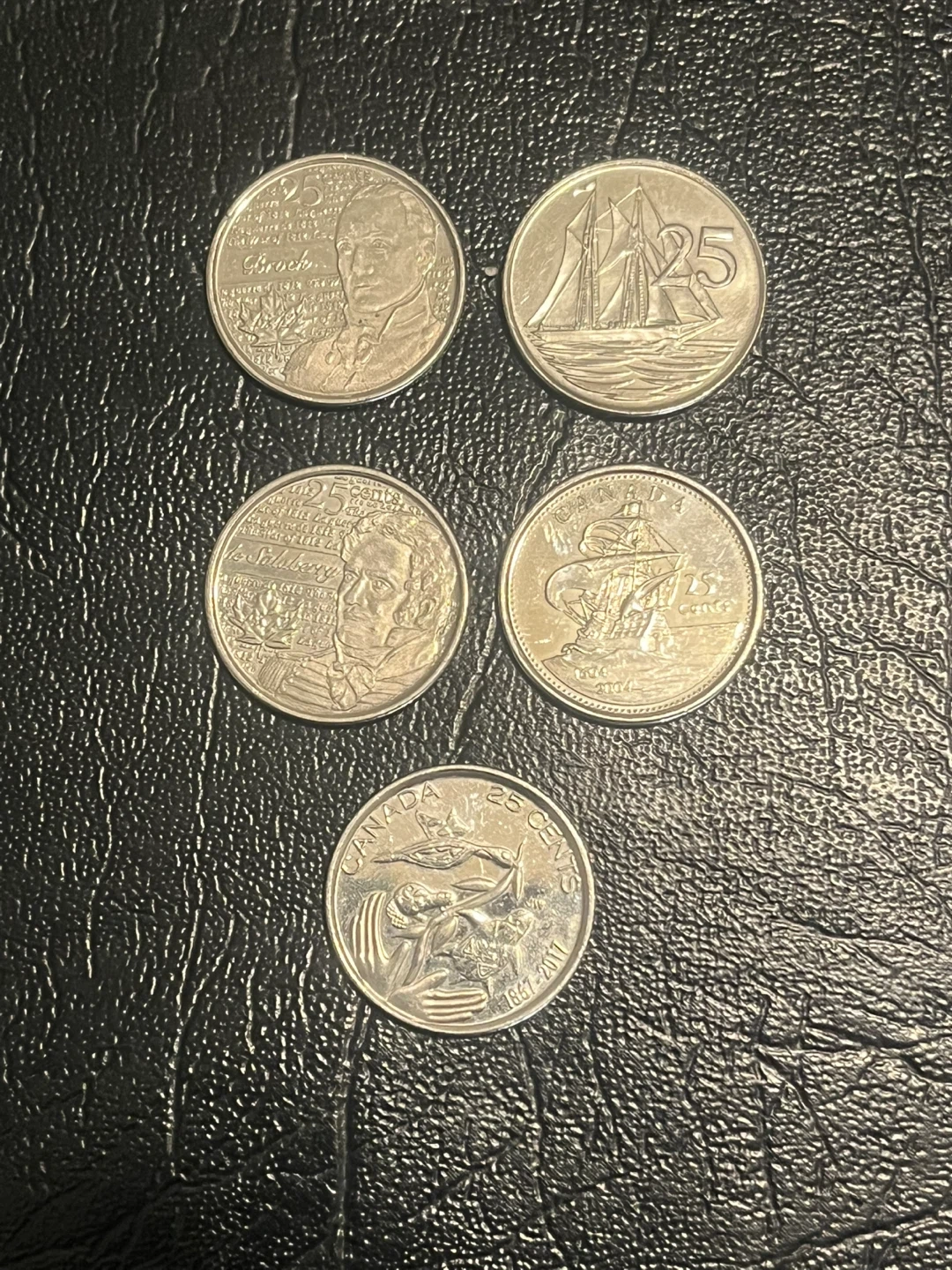 This lot includes five Canadian 25 cent coins, featuring various historical figures and scenes. These coins are great for collectors interested in Canadian numismatics.