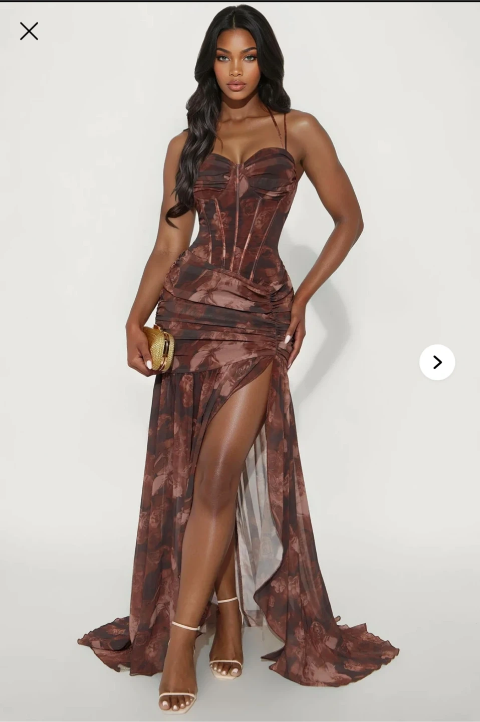 Here's a beautiful floral corset ruched slit maxi dress. Perfect for a special occasion or a night out. It features a corset bodice, a ruched skirt, and a high slit. The floral print is eye-catching and elegant. This dress is sure to turn heads! Brand new style sold out online