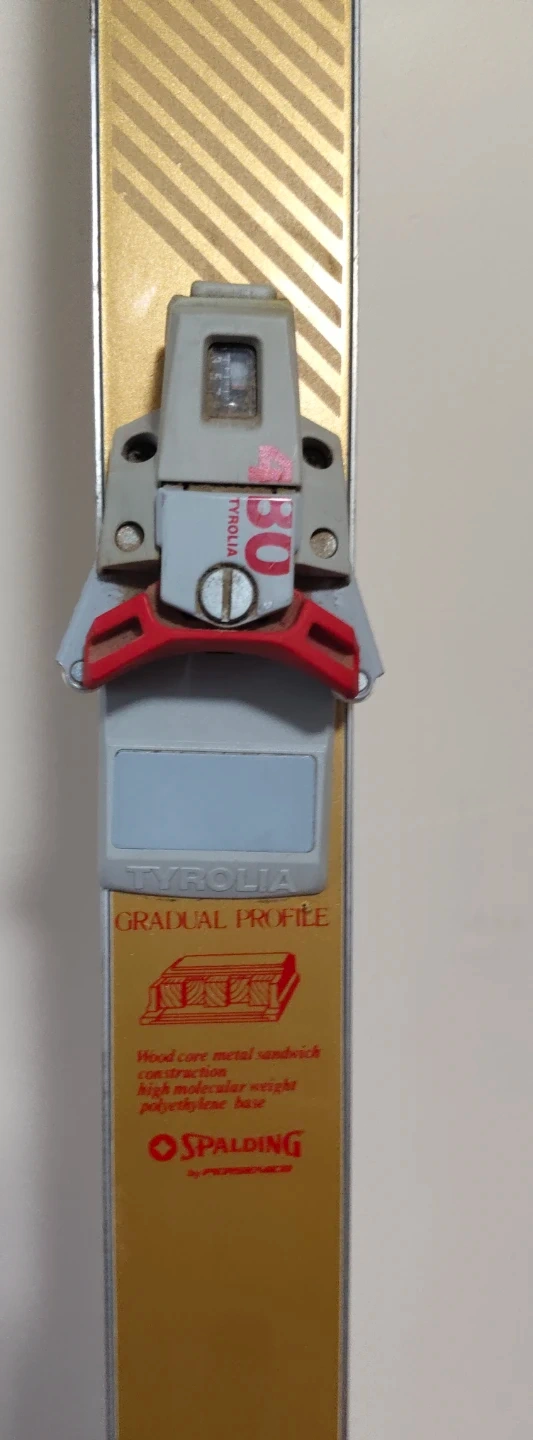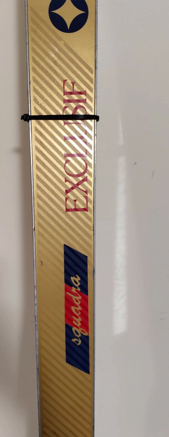 Spalding EXCLUSIVE SQUADRA skis featuring a wood core metal sandwich construction. They have a gradual profile and a high molecular weight polyethylene base. These skis are equipped with Tyroila 430 bindings.