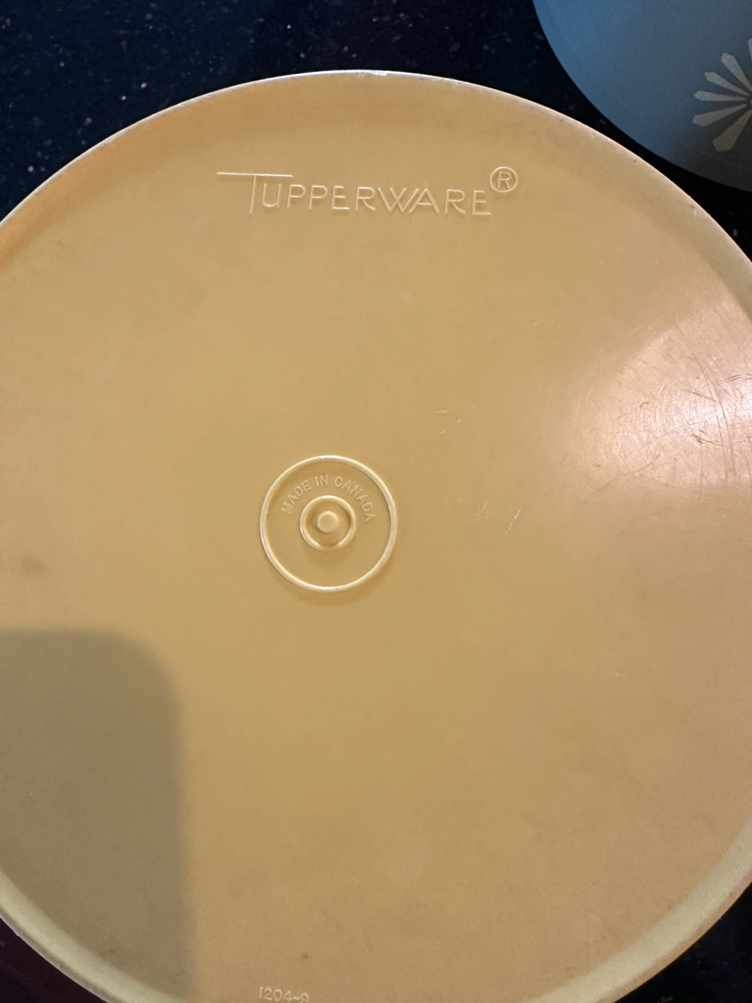 Set of four vintage Tupperware bowls in assorted colours. Includes two large bowls and one medium and one smaller nesting bowl with lid. Made in Canada.
