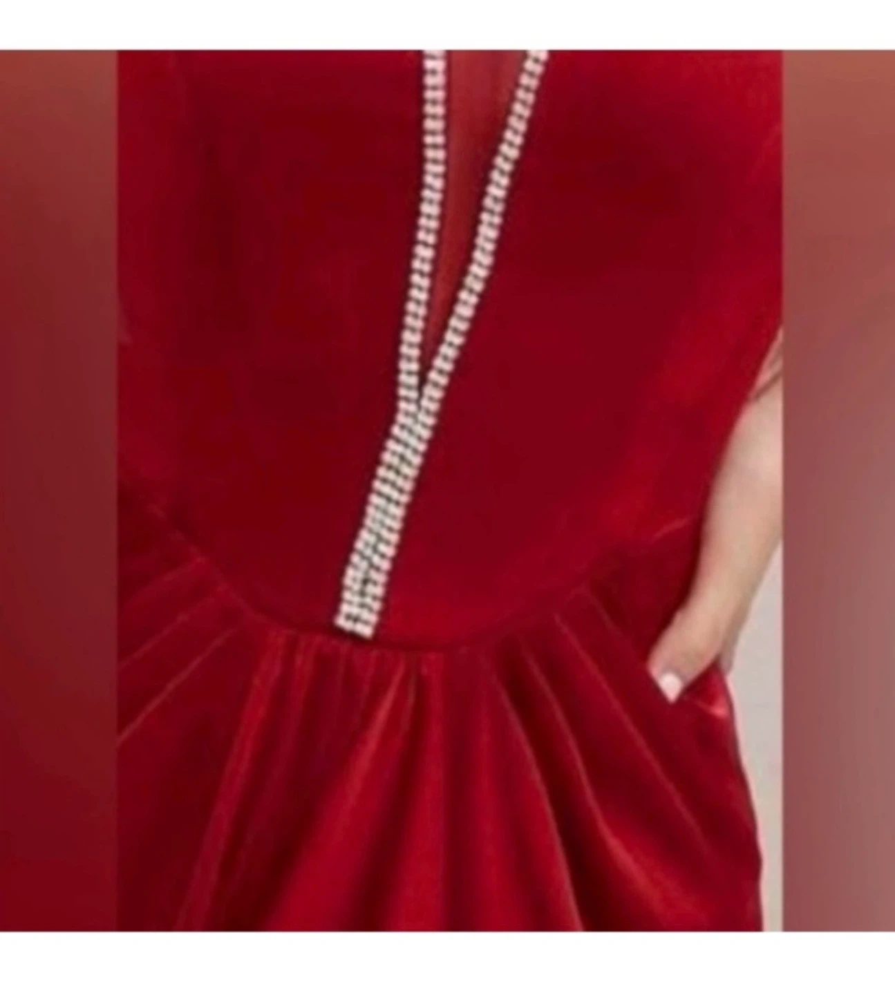 This elegant red strapless gown features a flattering ruched bodice and a shimmering rhinestone accent down the front. It has a concealed zipper closure at the back. The dress is floor-length with a high slit for added style. New, never worn. Size M