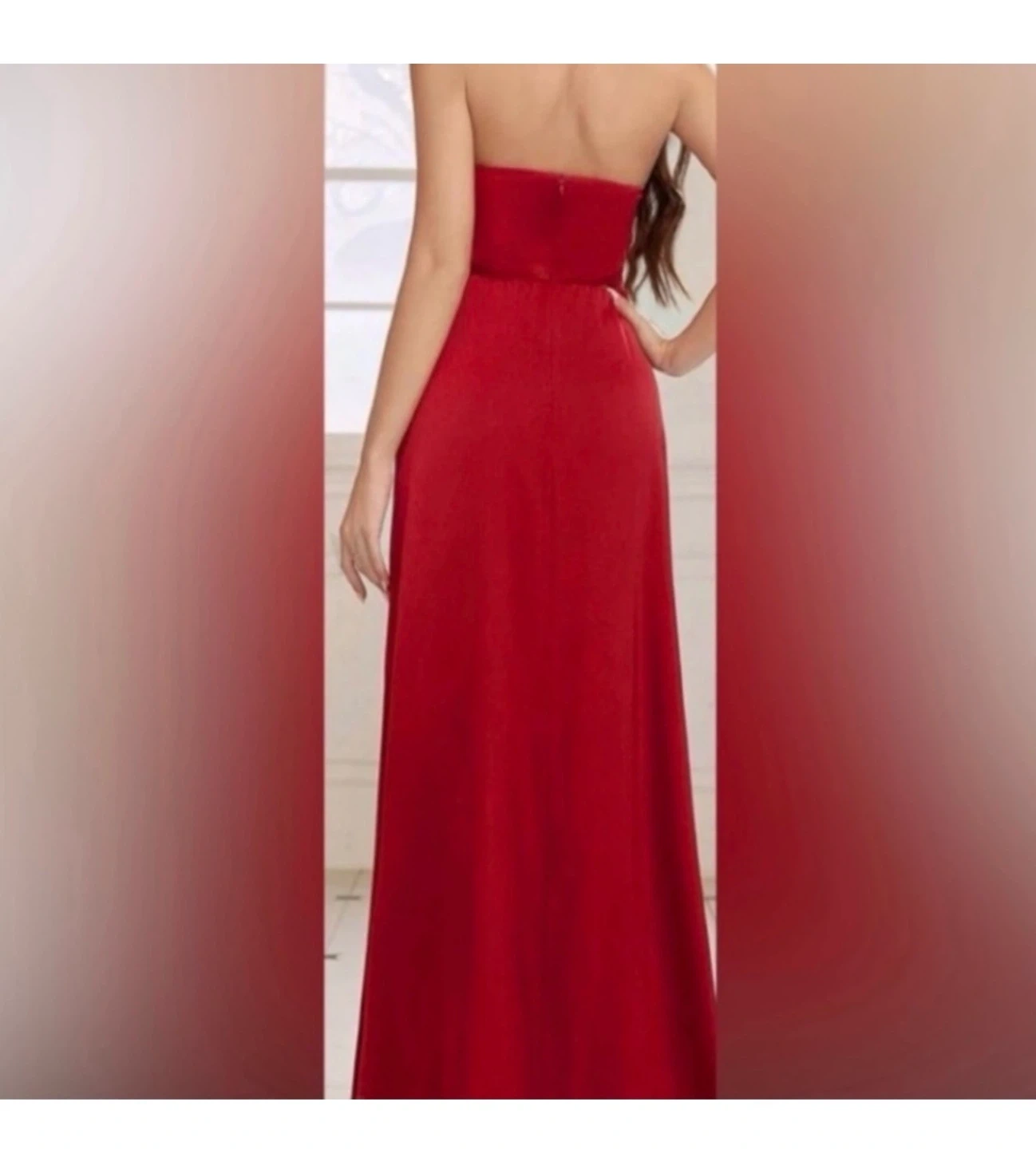 This elegant red strapless gown features a flattering ruched bodice and a shimmering rhinestone accent down the front. It has a concealed zipper closure at the back. The dress is floor-length with a high slit for added style. New, never worn. Size M