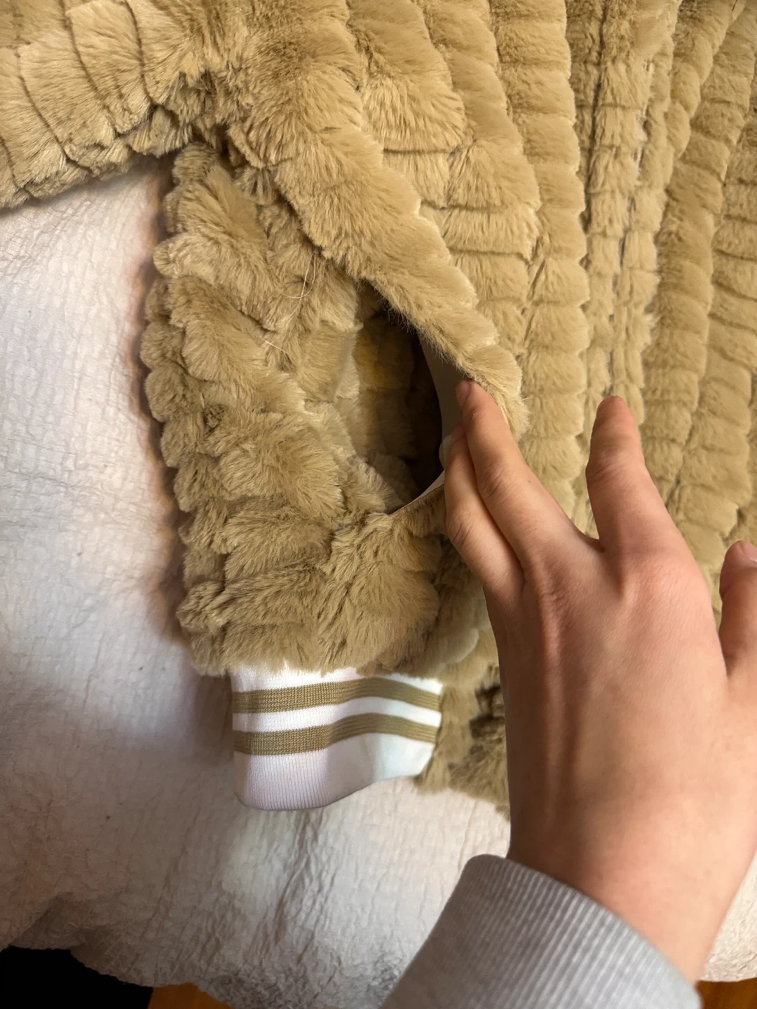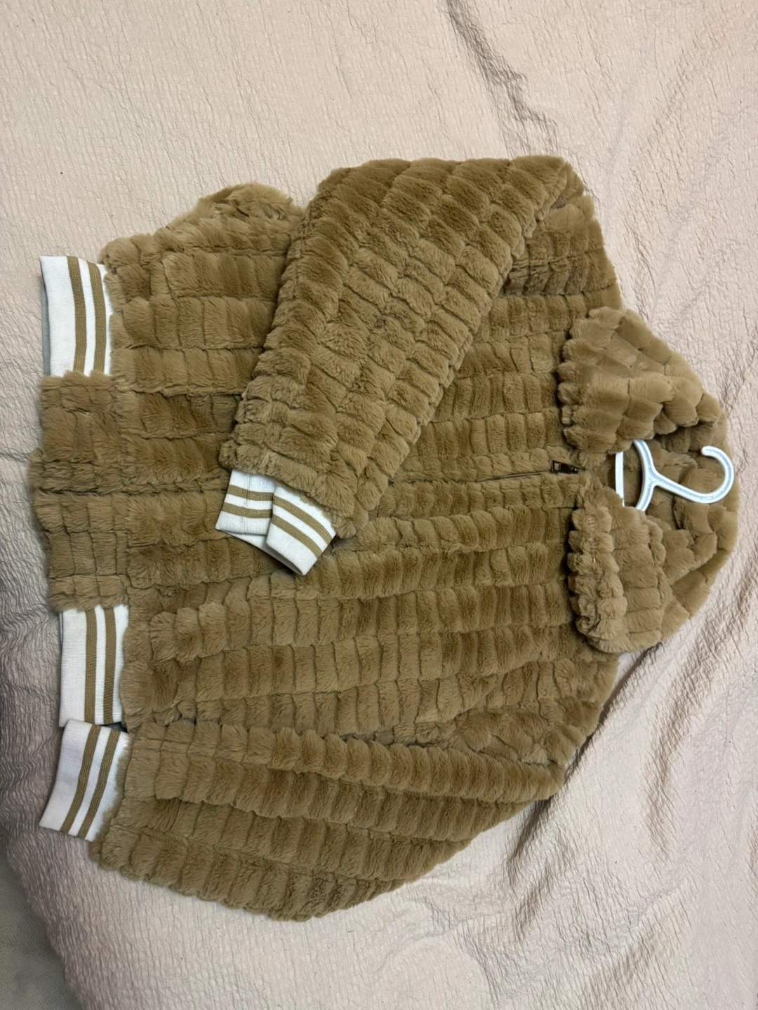 This Tommy Hilfiger jacket is made from a soft, textured faux fur material. It features a zip-up front and ribbed cuffs with stripes. The size is X-Large.