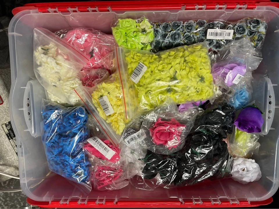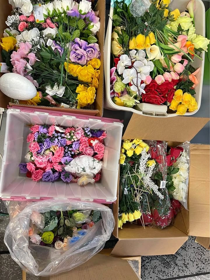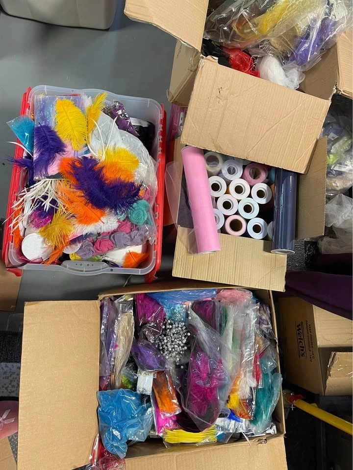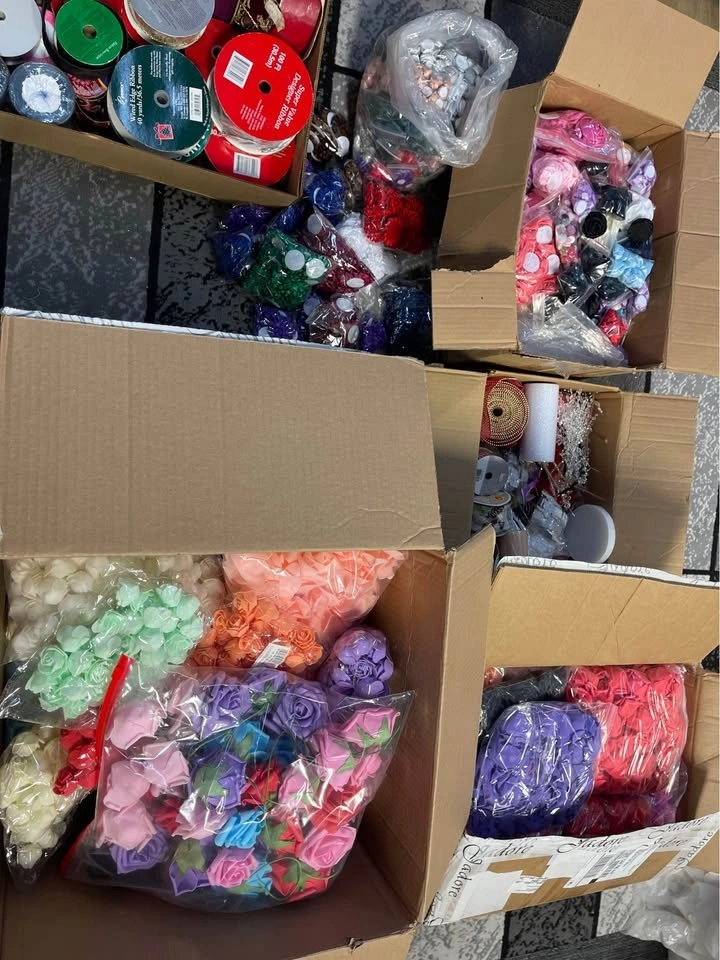 Many boxes of supplies including silk flowers, satin roses (different sizes), bouquet holders, ribbon, tulle, jewels, hat forms, feathers, etc. More than can be explained.