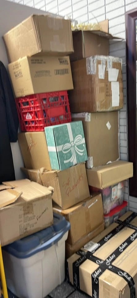 Many boxes of supplies including silk flowers, satin roses (different sizes), bouquet holders, ribbon, tulle, jewels, hat forms, feathers, etc. More than can be explained.