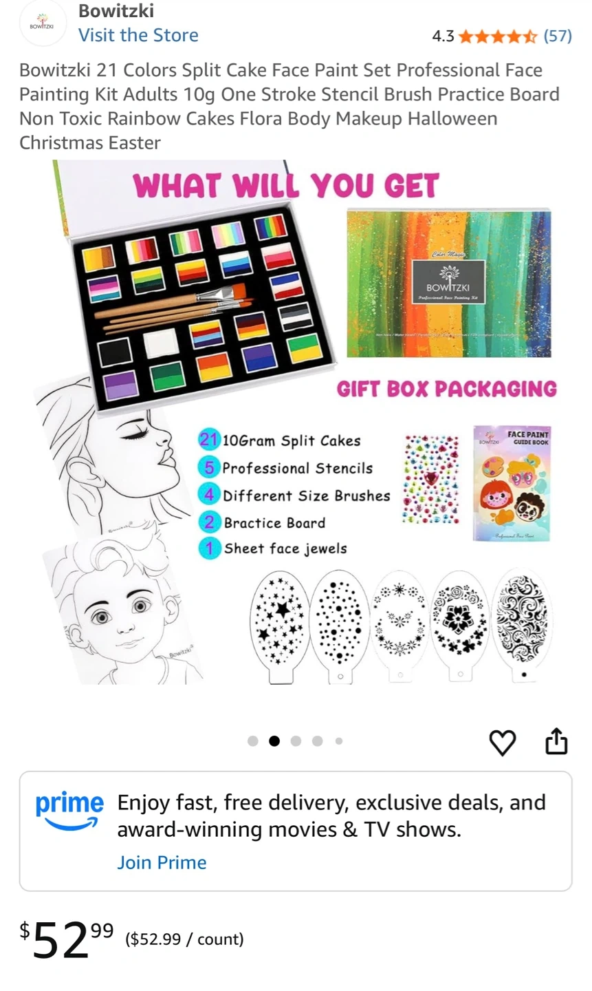 This professional face paint set includes 21 colours and 4 brushes. It also comes with reusable stencils and a practice board. Great for Halloween or Easter events!