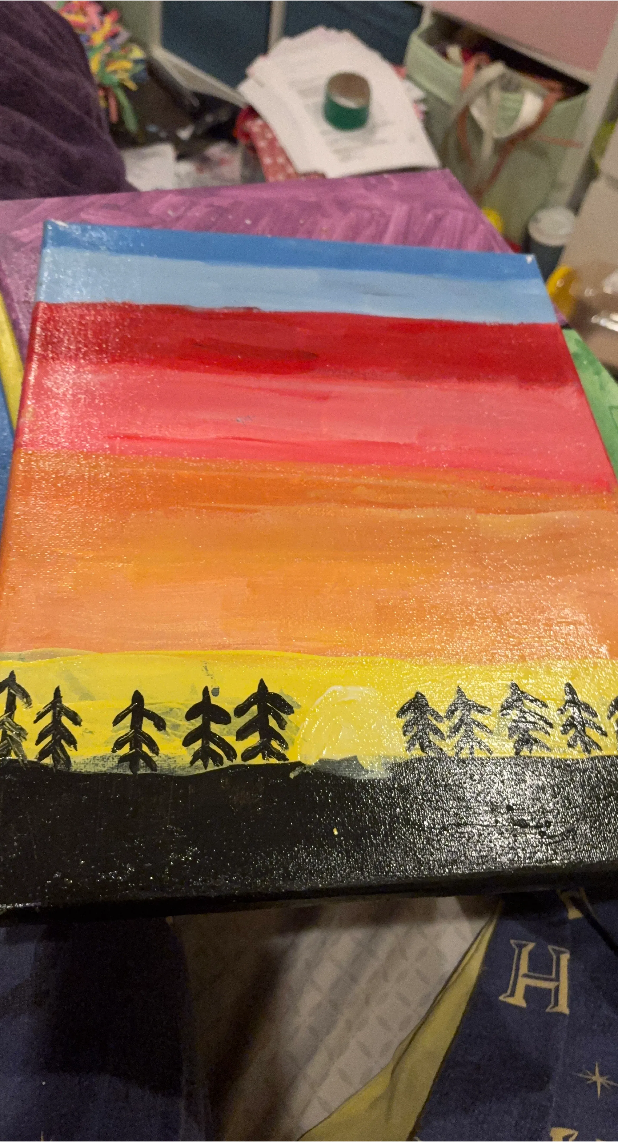 Selling a hand-painted canvas art piece! It features a colourful sunset scene with trees at the bottom. It would look great on any wall