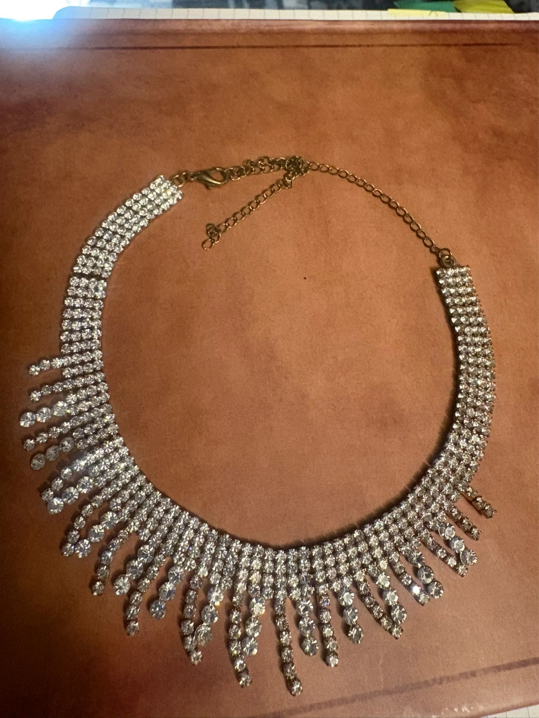 Sparkly rhinestone necklace with dangling fringe details. It has a gold-tone chain with an adjustable clasp. This necklace is a stunning accessory for any special occasion!